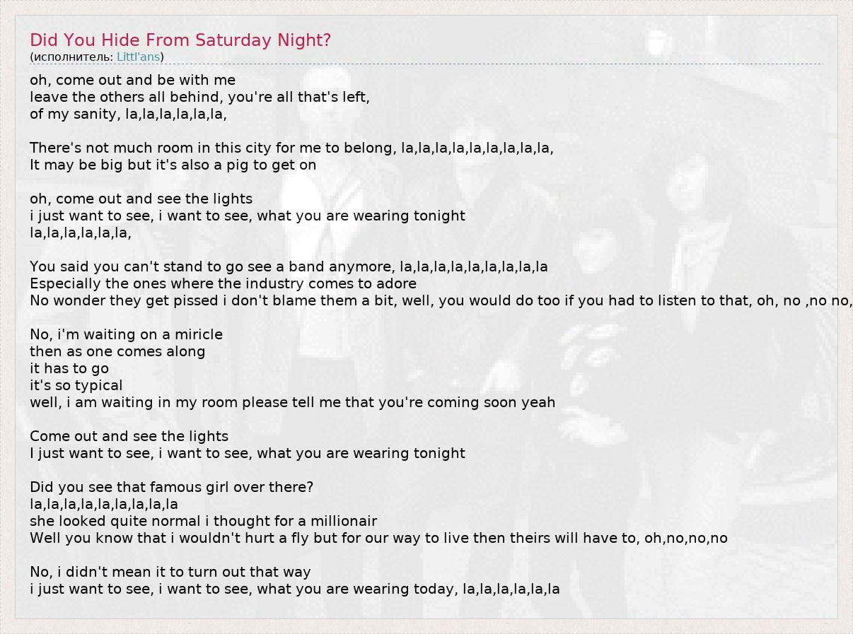 ГлавнаяИсполнителиLittl'ansDid You Hide From Saturday Night?
