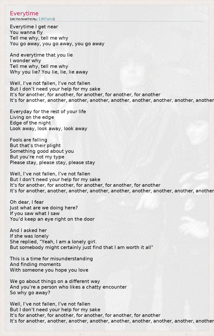 Everytime I get near You wanna fly Tell me why, tell me why You go away, you go away, you go away And everytime that you lie I wonder why Tell me why, tell me why Why you lie? You lie, lie, lie away Well, I've not fallen, I've not fallen But I don't need your help for my sake It's for another, for another, for another, for another, for another It's for another, another, another, another, another, another, another, another, another Everyday for the rest of your life Living on the edge Edge of the night Look away, look away, look away Fools are falling But that's their plight Something good about you But you're not my type Please stay, please stay, please stay Well, I've not fallen, I've not fallen But I don't need your help for my sake It's for another, for another, for another, for another, for another It's for another, another, another, another, another, another, another, another, another Oh dear, I fear Just what are we doing here? If you saw what I saw You'd keep an eye right on the door And I asked her If she was lonely She replied, "Yeah, I am a lonely girl. But somebody might certainly just find that I am worth it all" This is a time for misunderstanding And finding moments With someone you hope you love We go about things on a different way And you're a person who likes a chatty encounter So why go away? Well, I've not fallen, I've not fallen But I don't need your help for my sake It's for another, for another, for another, for another, for another It's for another, another, another, another, another, another, another, another, another