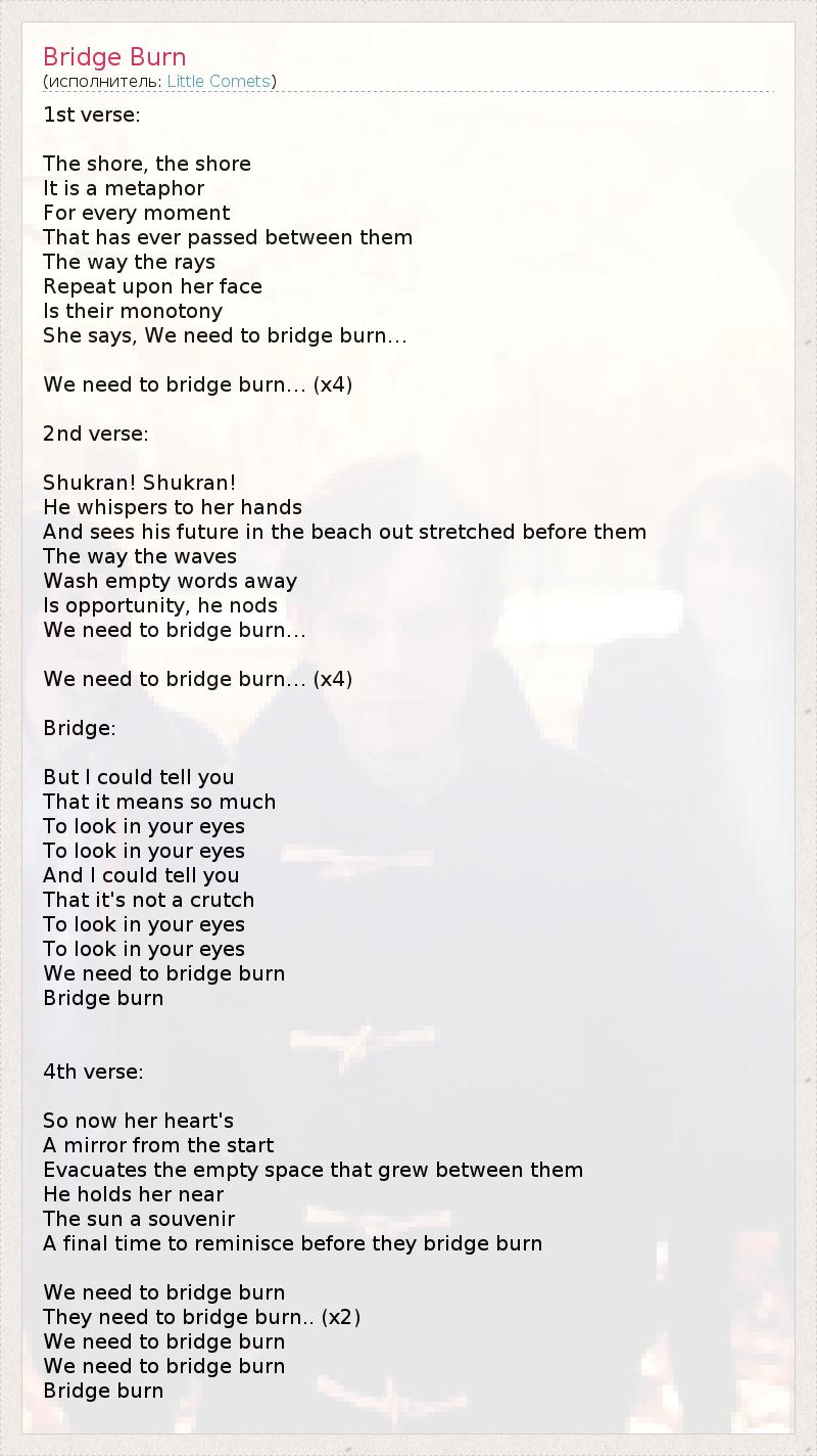 1st verse: The shore, the shore It is a metaphor For every moment That has ever passed between them The way the rays Repeat upon her face Is their monotony She says, We need to bridge burn… We need to bridge burn… (x4) 2nd verse: Shukran! Shukran! He whispers to her hands And sees his future in the beach out stretched before them The way the waves Wash empty words away Is opportunity, he nods We need to bridge burn… We need to bridge burn… (x4) Bridge: But I could tell you That it means so much To look in your eyes To look in your eyes And I could tell you That it's not a crutch To look in your eyes To look in your eyes We need to bridge burn Bridge burn 4th verse: So now her heart's A mirror from the start Evacuates the empty space that grew between them He holds her near The sun a souvenir A final time to reminisce before they bridge burn We need to bridge burn They need to bridge burn.. (x2) We need to bridge burn We need to bridge burn Bridge burn