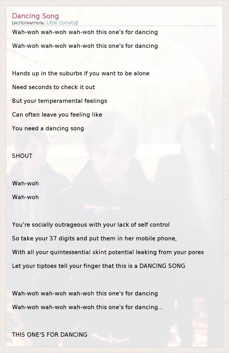Wah-woh wah-woh wah-woh this one's for dancing Wah-woh wah-woh wah-woh this one's for dancing Hands up in the suburbs if you want to be alone Need seconds to check it out But your temperamental feelings Can often leave you feeling like You need a dancing song SHOUT Wah-woh Wah-woh You're socially outrageous with your lack of self control So take your 37 digits and put them in her mobile phone, With all your quintessential skint potential leaking from your pores Let your tiptoes tell your finger that this is a DANCING SONG Wah-woh wah-woh wah-woh this one's for dancing Wah-woh wah-woh wah-woh this one's for dancing... THIS ONE'S FOR DANCING
