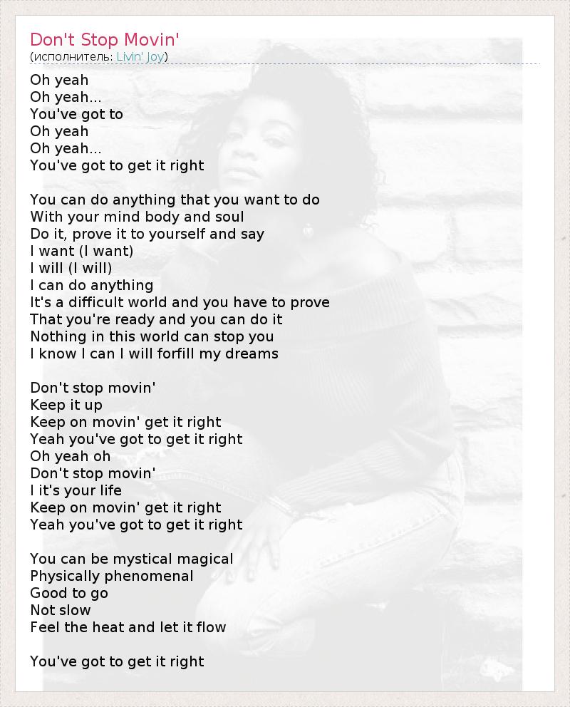 Oh yeah Oh yeah... You've got to Oh yeah Oh yeah... You've got to get it right You can do anything that you want to do With your mind body and soul Do it, prove it to yourself and say I want (I want) I will (I will) I can do anything It's a difficult world and you have to prove That you're ready and you can do it Nothing in this world can stop you I know I can I will forfill my dreams Don't stop movin' Keep it up Keep on movin' get it right Yeah you've got to get it right Oh yeah oh Don't stop movin' I it's your life Keep on movin' get it right Yeah you've got to get it right You can be mystical magical Physically phenomenal Good to go Not slow Feel the heat and let it flow You've got to get it right