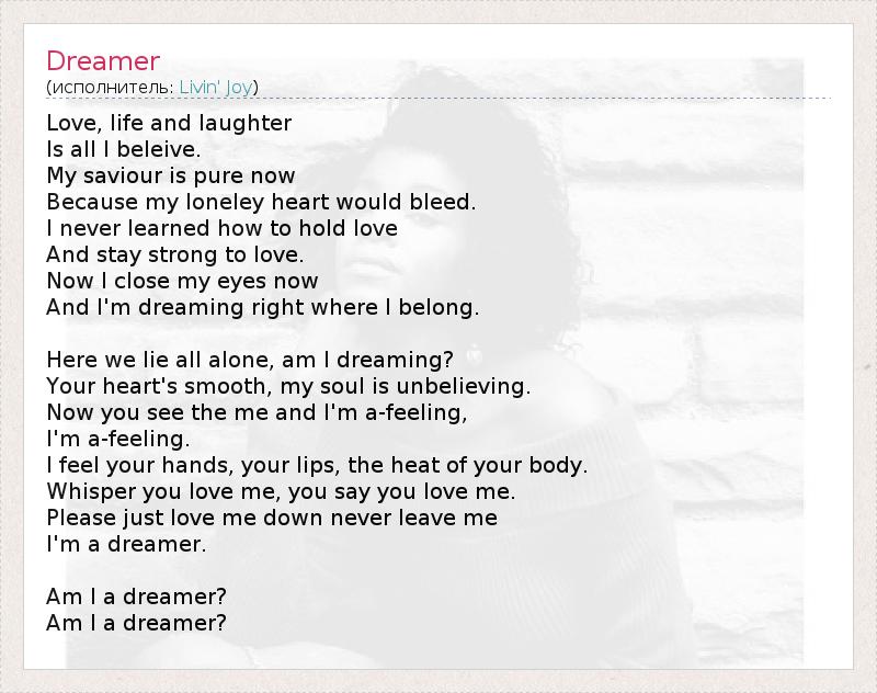 Love, life and laughter Is all I beleive. My saviour is pure now Because my loneley heart would bleed. I never learned how to hold love And stay strong to love. Now I close my eyes now And I'm dreaming right where I belong. Here we lie all alone, am I dreaming? Your heart's smooth, my soul is unbelieving. Now you see the me and I'm a-feeling, I'm a-feeling. I feel your hands, your lips, the heat of your body. Whisper you love me, you say you love me. Please just love me down never leave me I'm a dreamer. Am I a dreamer? Am I a dreamer?