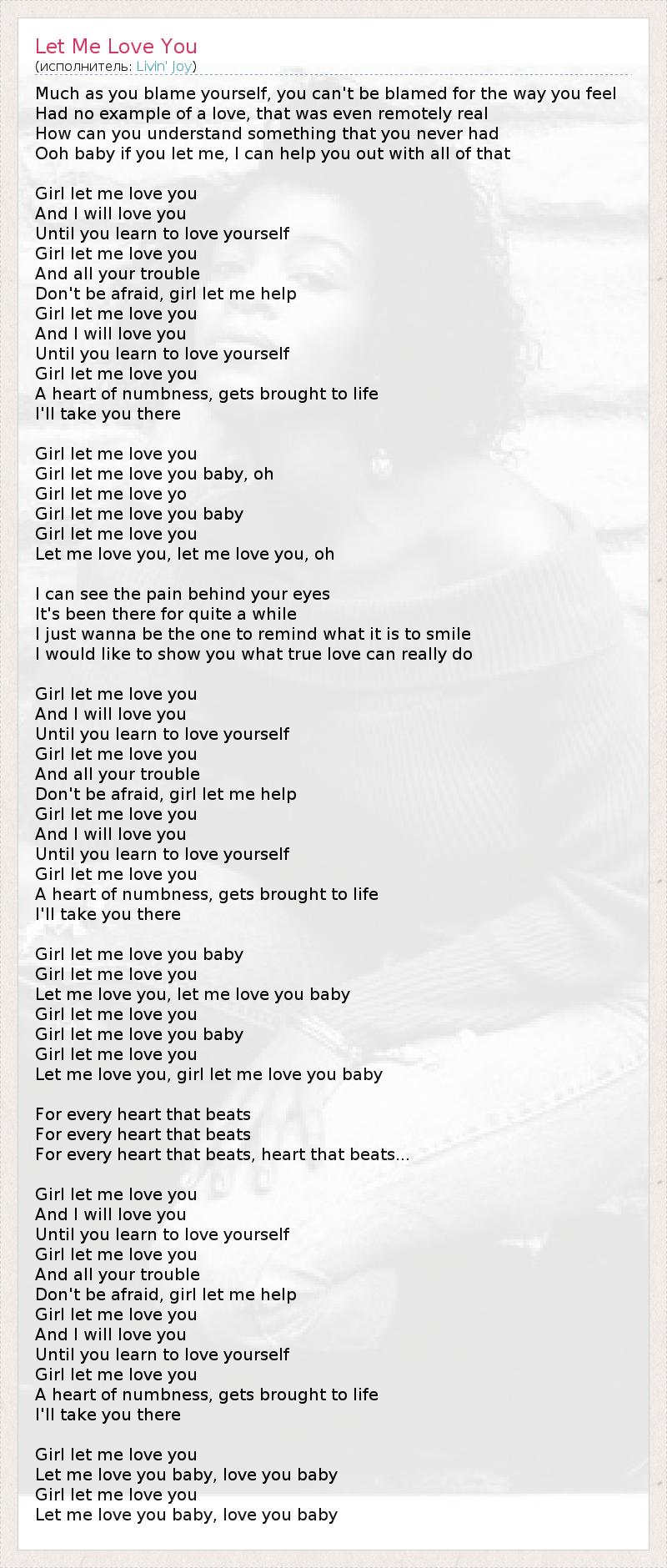 Much as you blame yourself, you can't be blamed for the way you feel Had no example of a love, that was even remotely real How can you understand something that you never had Ooh baby if you let me, I can help you out with all of that Girl let me love you And I will love you Until you learn to love yourself Girl let me love you And all your trouble Don't be afraid, girl let me help Girl let me love you And I will love you Until you learn to love yourself Girl let me love you A heart of numbness, gets brought to life I'll take you there Girl let me love you Girl let me love you baby, oh Girl let me love yo Girl let me love you baby Girl let me love you Let me love you, let me love you, oh I can see the pain behind your eyes It's been there for quite a while I just wanna be the one to remind what it is to smile I would like to show you what true love can really do Girl let me love you And I will love you Until you learn to love yourself Girl let me love you And all your trouble Don't be afraid, girl let me help Girl let me love you And I will love you Until you learn to love yourself Girl let me love you A heart of numbness, gets brought to life I'll take you there Girl let me love you baby Girl let me love you Let me love you, let me love you baby Girl let me love you Girl let me love you baby Girl let me love you Let me love you, girl let me love you baby For every heart that beats For every heart that beats For every heart that beats, heart that beats... Girl let me love you And I will love you Until you learn to love yourself Girl let me love you And all your trouble Don't be afraid, girl let me help Girl let me love you And I will love you Until you learn to love yourself Girl let me love you A heart of numbness, gets brought to life I'll take you there Girl let me love you Let me love you baby, love you baby Girl let me love you Let me love you baby, love you baby