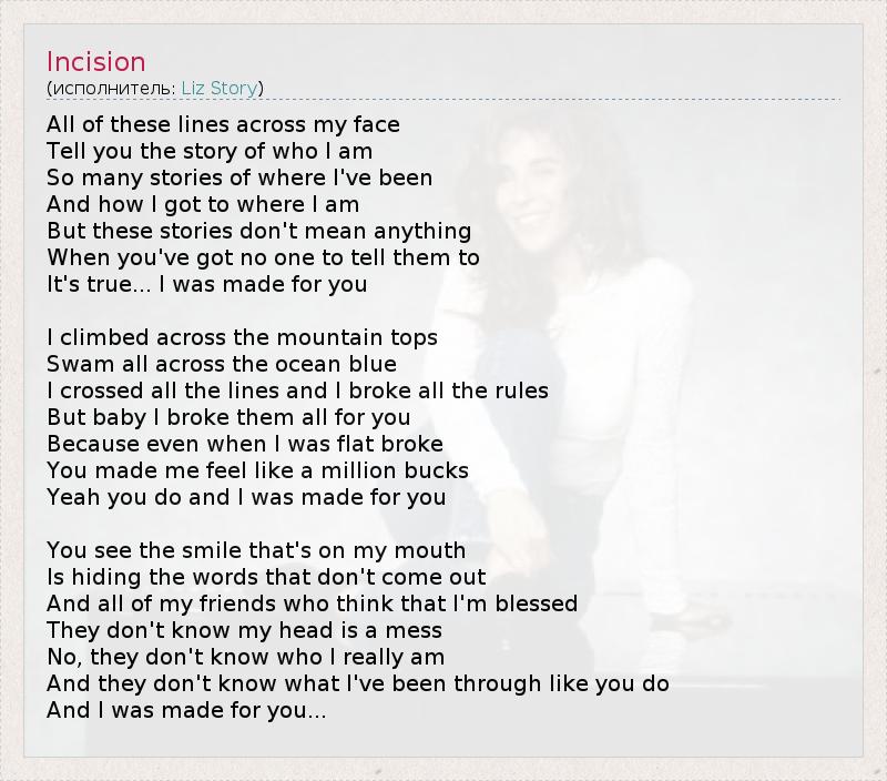Все эти морщинки на моем лице Рассказывают тебе историю о том, кто я, Множество историй о том, где я бывала, И как я оказалась здесь. Но эти истории ничего не значат, Когда их некому рассказать. Это так... я создана для тебя. Я покорила все вершины, Проплыла всю синь океана, Я перечеркнула все линии и нарушила все правила, Но, малыш, я сделала все это для тебя. Ведь когда у меня в кармане не было ни гроша, Ты позволял мне чувствовать себя так, будто там миллион баксов. Да ты и позволяшь, а я создана для тебя. Ты видишь улыбку на моих губах, Скрывающую слова, которые у меня не получается произнести. Все мои друзья, думающие, что я счастлива, Не знают, что у меня в голове путаница. Нет, они не знают, кто я на самом деле. И они не знают так, как ты, через что я прошла. И я создана для тебя...
