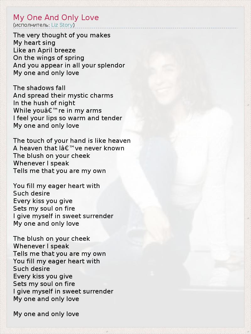 The very thought of you makes My heart sing Like an April breeze On the wings of spring And you appear in all your splendor My one and only love The shadows fall And spread their mystic charms In the hush of night While you’re in my arms I feel your lips so warm and tender My one and only love The touch of your hand is like heaven A heaven that I’ve never known The blush on your cheek Whenever I speak Tells me that you are my own You fill my eager heart with Such desire Every kiss you give Sets my soul on fire I give myself in sweet surrender My one and only love The blush on your cheek Whenever I speak Tells me that you are my own You fill my eager heart with Such desire Every kiss you give Sets my soul on fire I give myself in sweet surrender My one and only love My one and only love