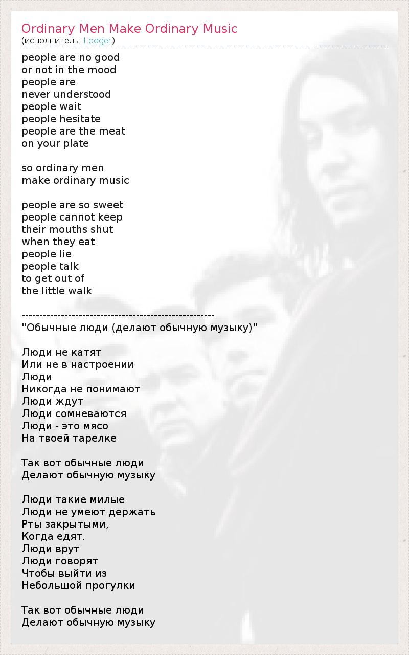 people are no good or not in the mood people are never understood people wait people hesitate people are the meat on your plate so ordinary men make ordinary music people are so sweet people cannot keep their mouths shut when they eat people lie people talk to get out of the little walk ------------------------------------------------------ "Обычные люди (делают обычную музыку)" Люди не катят Или не в настроении Люди Никогда не понимают Люди ждут Люди сомневаются Люди - это мясо На твоей тарелке Так вот обычные люди Делают обычную музыку Люди такие милые Люди не умеют держать Рты закрытыми, Когда едят. Люди врут Люди говорят Чтобы выйти из Небольшой прогулки Так вот обычные люди Делают обычную музыку