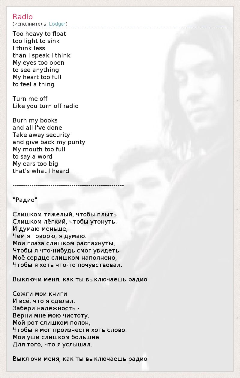 Too heavy to float too light to sink I think less than I speak I think My eyes too open to see anything My heart too full to feel a thing Turn me off Like you turn off radio Burn my books and all I've done Take away security and give back my purity My mouth too full to say a word My ears too big that's what I heard ----------------------------------------------------- "Радио" Слишком тяжелый, чтобы плыть Слишком лёгкий, чтобы утонуть. И думаю меньше, Чем я говорю, я думаю. Мои глаза слишком распахнуты, Чтобы я что-нибудь смог увидеть. Моё сердце слишком наполнено, Чтобы я хоть что-то почувствовал. Выключи меня, как ты выключаешь радио Сожги мои книги И всё, что я сделал. Забери надёжность - Верни мне мою чистоту. Мой рот слишком полон, Чтобы я мог произнести хоть слово. Мои уши слишком большие Для того, что я услышал. Выключи меня, как ты выключаешь радио
