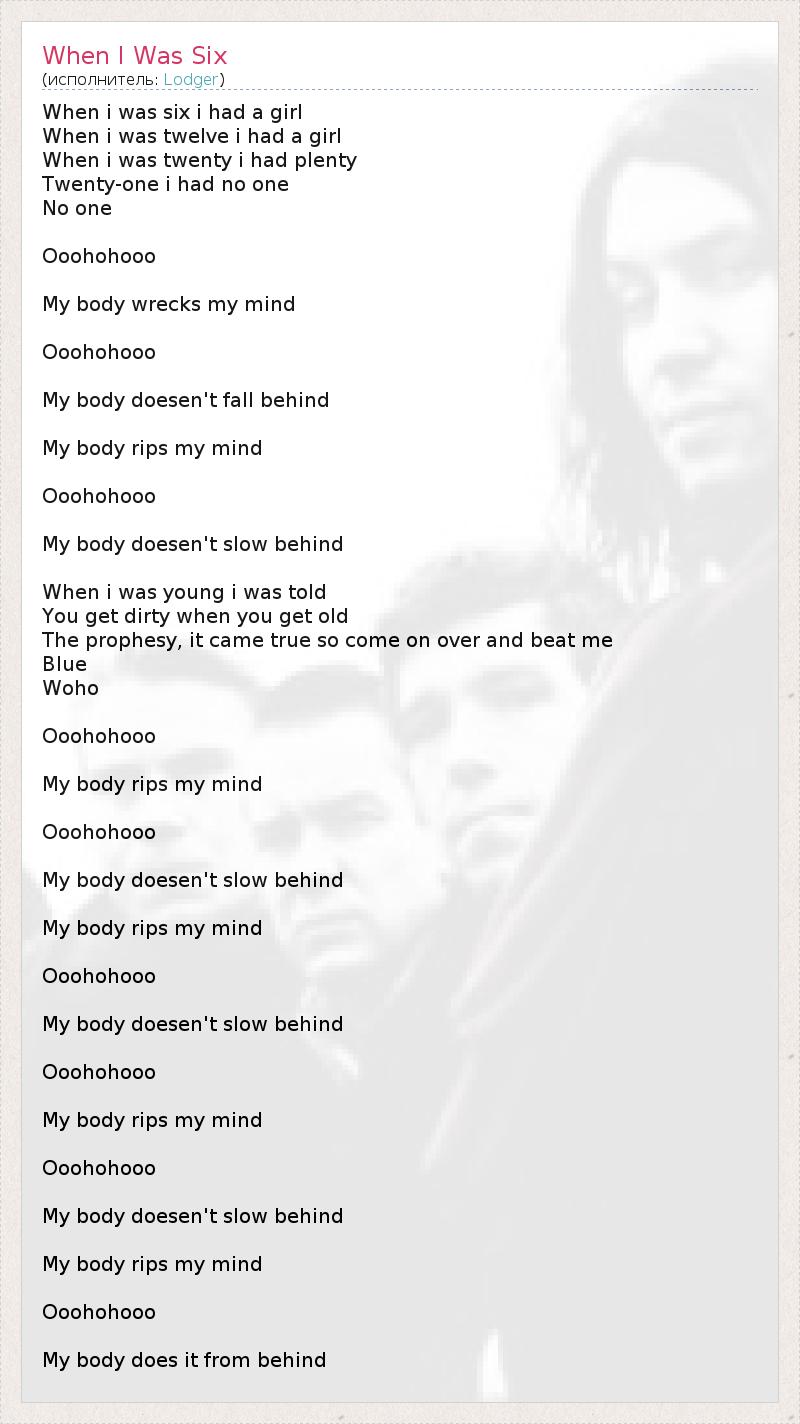 When i was six i had a girl When i was twelve i had a girl When i was twenty i had plenty Twenty-one i had no one No one Ooohohooo My body wrecks my mind Ooohohooo My body doesen't fall behind My body rips my mind Ooohohooo My body doesen't slow behind When i was young i was told You get dirty when you get old The prophesy, it came true so come on over and beat me Blue Woho Ooohohooo My body rips my mind Ooohohooo My body doesen't slow behind My body rips my mind Ooohohooo My body doesen't slow behind Ooohohooo My body rips my mind Ooohohooo My body doesen't slow behind My body rips my mind Ooohohooo My body does it from behind