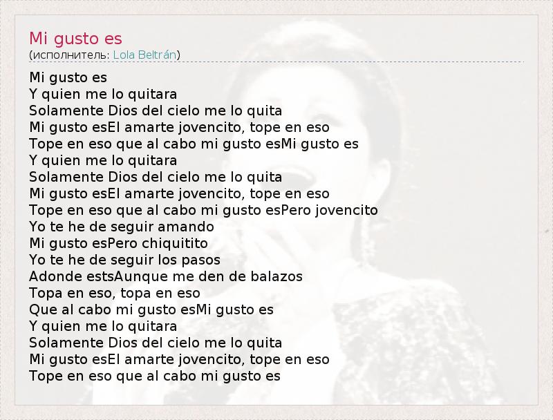 Mi gusto es Y quien me lo quitara Solamente Dios del cielo me lo quita Mi gusto esEl amarte jovencito, tope en eso Tope en eso que al cabo mi gusto esMi gusto es Y quien me lo quitara Solamente Dios del cielo me lo quita Mi gusto esEl amarte jovencito, tope en eso Tope en eso que al cabo mi gusto esPero jovencito Yo te he de seguir amando Mi gusto esPero chiquitito Yo te he de seguir los pasos Adonde estsAunque me den de balazos Topa en eso, topa en eso Que al cabo mi gusto esMi gusto es Y quien me lo quitara Solamente Dios del cielo me lo quita Mi gusto esEl amarte jovencito, tope en eso Tope en eso que al cabo mi gusto es