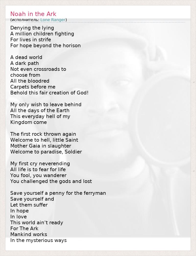 Denying the lying A million children fighting For lives in strife For hope beyond the horison A dead world A dark path Not even crossroads to choose from All the bloodred Carpets before me Behold this fair creation of God! My only wish to leave behind All the days of the Earth This everyday hell of my Kingdom come The first rock thrown again Welcome to hell, little Saint Mother Gaia in slaughter Welcome to paradise, Soldier My first cry neverending All life is to fear for life You fool, you wanderer You challenged the gods and lost Save yourself a penny for the ferryman Save yourself and Let them suffer In hope In love This world ain't ready For The Ark Mankind works In the mysterious ways