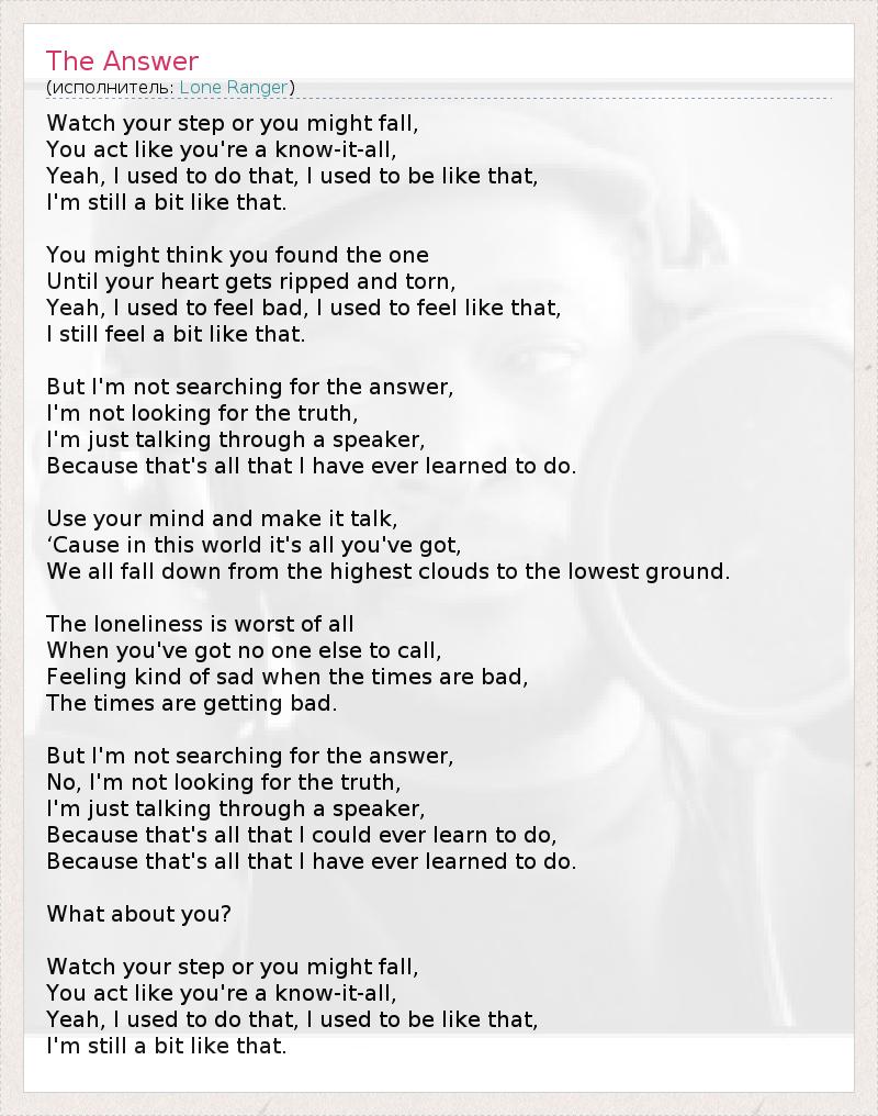 Следи за собой, иначе можешь упасть, Ты ведёшь себя как всезнайка, Да, я делал так раньше, я был таким, Да и сейчас остался немного. Ты можешь думать, что нашёл ту, единственную, Пока твоё сердце не вырвут и разобьют, Да, мне было плохо, раньше я чувствовал себя так, Да и сейчас чувствую немного. Но я не ищу ответа, Я не ищу истины, Я лишь вещаю через колонки, Потому что это единственное, чему я научился. Пользуйся головой, шевели мозгами, Потому что только они есть у тебя в этом мире, Мы все падаем с самых высоких облаков в самые низкие земли. Одиночество хуже всего, Когда тебе больше некому звонить, Как-то грустно становится в трудные времена, Времена становятся труднее. Но я не ищу ответа, Я не ищу истины, Я лишь вещаю через колонки, Потому что это единственное, чему я мог научиться, Потому что это единственное, чему я научился. А что насчёт тебя? Следи за собой, иначе можешь упасть, Ты ведёшь себя как всезнайка, Да, я делал так раньше, я был таким, Да и сейчас остался немного.