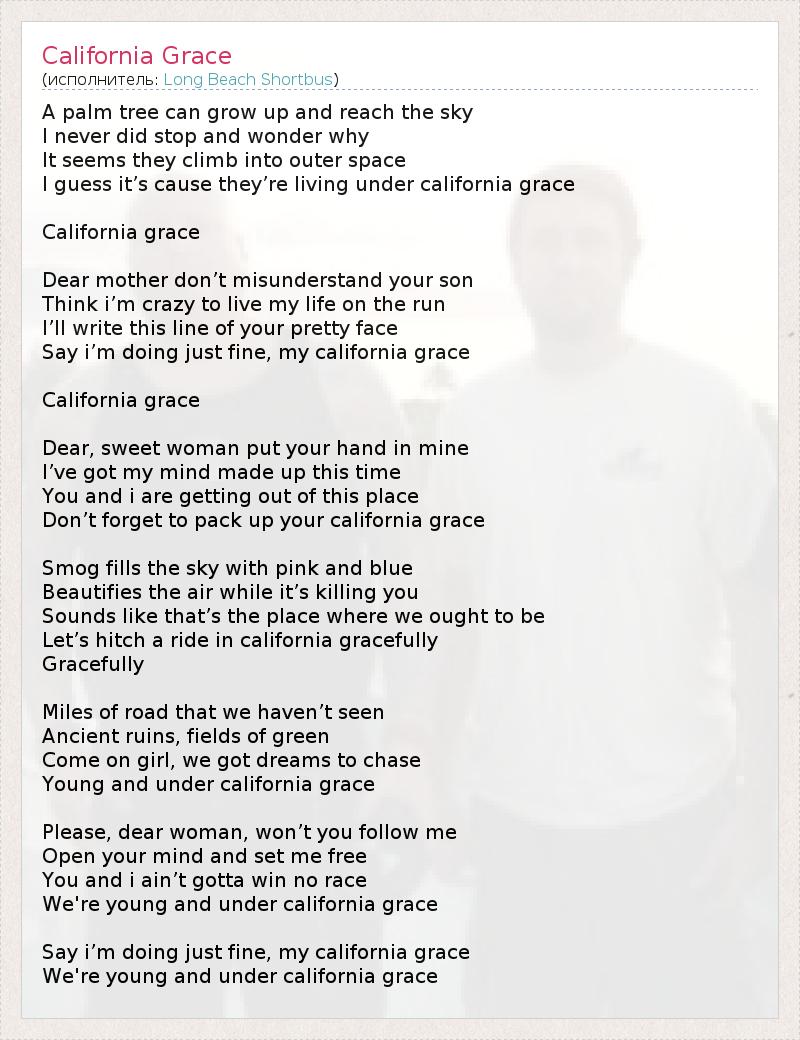 A palm tree can grow up and reach the sky I never did stop and wonder why It seems they climb into outer space I guess it’s cause they’re living under california grace California grace Dear mother don’t misunderstand your son Think i’m crazy to live my life on the run I’ll write this line of your pretty face Say i’m doing just fine, my california grace California grace Dear, sweet woman put your hand in mine I’ve got my mind made up this time You and i are getting out of this place Don’t forget to pack up your california grace Smog fills the sky with pink and blue Beautifies the air while it’s killing you Sounds like that’s the place where we ought to be Let’s hitch a ride in california gracefully Gracefully Miles of road that we haven’t seen Ancient ruins, fields of green Come on girl, we got dreams to chase Young and under california grace Please, dear woman, won’t you follow me Open your mind and set me free You and i ain’t gotta win no race We're young and under california grace Say i’m doing just fine, my california grace We're young and under california grace