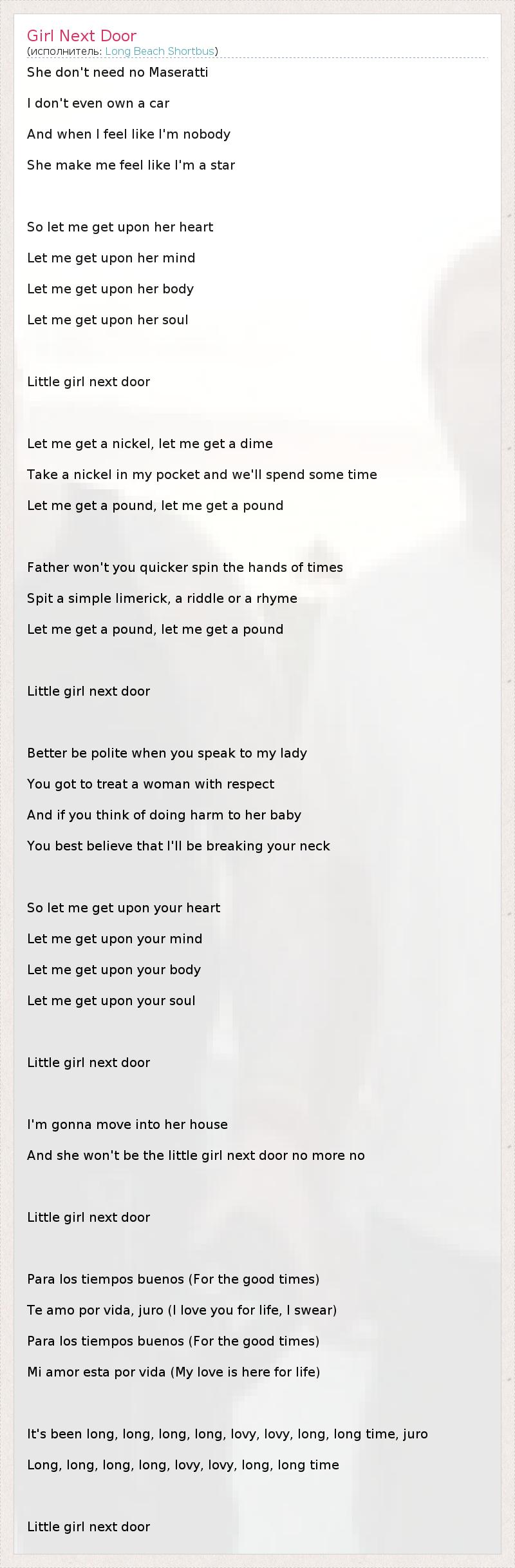 She don't need no Maseratti I don't even own a car And when I feel like I'm nobody She make me feel like I'm a star So let me get upon her heart Let me get upon her mind Let me get upon her body Let me get upon her soul Little girl next door Let me get a nickel, let me get a dime Take a nickel in my pocket and we'll spend some time Let me get a pound, let me get a pound Father won't you quicker spin the hands of times Spit a simple limerick, a riddle or a rhyme Let me get a pound, let me get a pound Little girl next door Better be polite when you speak to my lady You got to treat a woman with respect And if you think of doing harm to her baby You best believe that I'll be breaking your neck So let me get upon your heart Let me get upon your mind Let me get upon your body Let me get upon your soul Little girl next door I'm gonna move into her house And she won't be the little girl next door no more no Little girl next door Para los tiempos buenos (For the good times) Te amo por vida, juro (I love you for life, I swear) Para los tiempos buenos (For the good times) Mi amor esta por vida (My love is here for life) It's been long, long, long, long, lovy, lovy, long, long time, juro Long, long, long, long, lovy, lovy, long, long time Little girl next door