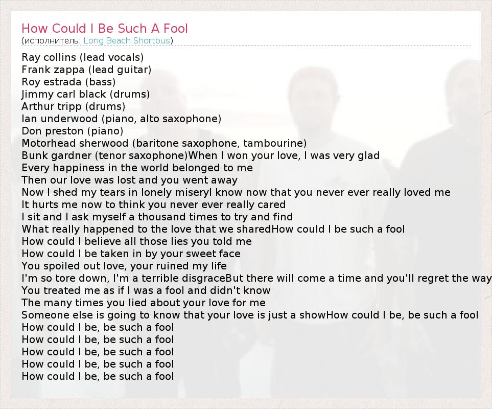 Ray collins (lead vocals) Frank zappa (lead guitar) Roy estrada (bass) Jimmy carl black (drums) Arthur tripp (drums) Ian underwood (piano, alto saxophone) Don preston (piano) Motorhead sherwood (baritone saxophone, tambourine) Bunk gardner (tenor saxophone)When I won your love, I was very glad Every happiness in the world belonged to me Then our love was lost and you went away Now I shed my tears in lonely miseryI know now that you never ever really loved me It hurts me now to think you never ever really cared I sit and I ask myself a thousand times to try and find What really happened to the love that we sharedHow could I be such a fool How could I believe all those lies you told me How could I be taken in by your sweet face You spoiled out love, your ruined my life I'm so tore down, I'm a terrible disgraceBut there will come a time and you'll regret the way You treated me as if I was a fool and didn't know The many times you lied about your love for me Someone else is going to know that your love is just a showHow could I be, be such a fool How could I be, be such a fool How could I be, be such a fool How could I be, be such a fool How could I be, be such a fool How could I be, be such a fool