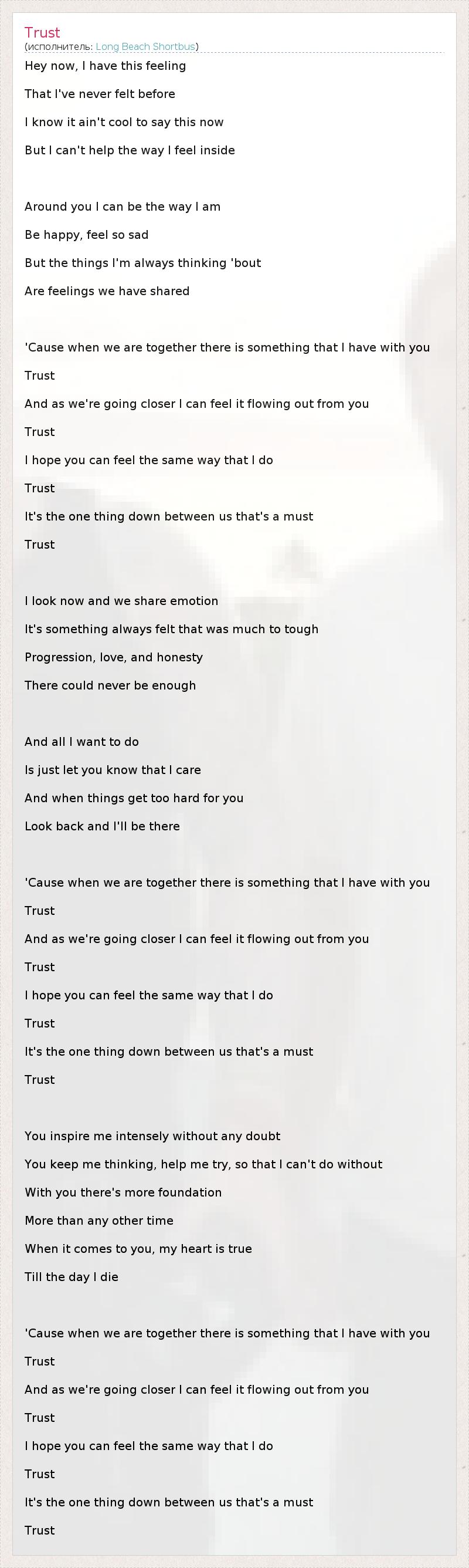 Hey now, I have this feeling That I've never felt before I know it ain't cool to say this now But I can't help the way I feel inside Around you I can be the way I am Be happy, feel so sad But the things I'm always thinking 'bout Are feelings we have shared 'Cause when we are together there is something that I have with you Trust And as we're going closer I can feel it flowing out from you Trust I hope you can feel the same way that I do Trust It's the one thing down between us that's a must Trust I look now and we share emotion It's something always felt that was much to tough Progression, love, and honesty There could never be enough And all I want to do Is just let you know that I care And when things get too hard for you Look back and I'll be there 'Cause when we are together there is something that I have with you Trust And as we're going closer I can feel it flowing out from you Trust I hope you can feel the same way that I do Trust It's the one thing down between us that's a must Trust You inspire me intensely without any doubt You keep me thinking, help me try, so that I can't do without With you there's more foundation More than any other time When it comes to you, my heart is true Till the day I die 'Cause when we are together there is something that I have with you Trust And as we're going closer I can feel it flowing out from you Trust I hope you can feel the same way that I do Trust It's the one thing down between us that's a must Trust
