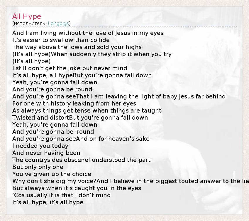 And I am living without the love of Jesus in my eyes It's easier to swallow than collide The way above the lows and sold your highs (It's all hype)When suddenly they strip it when you try (It's all hype) I still don't get the joke but never mind It's all hype, all hypeBut you're gonna fall down Yeah, you're gonna fall down And you're gonna be round And you're gonna seeThat I am leaving the light of baby Jesus far behind For one with history leaking from her eyes As always things get tense when things are taught Twisted and distortBut you're gonna fall down Yeah, you're gonna fall down And you're gonna be 'round And you're gonna seeAnd on for heaven's sake I needed you today And never having been The countrysides obsceneI understood the part But only only one You've given up the choice Why don't she dig my voice?And I believe in the biggest touted answer to the lie But always when it's caught you in the eyes 'Cos usually it is that I don't mind It's all hype, it's all hype