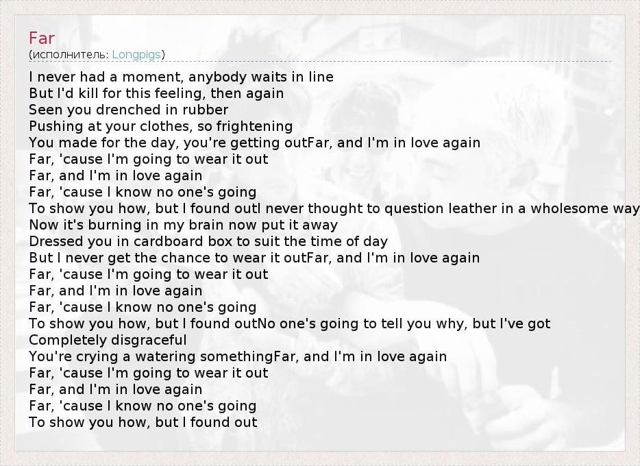 I never had a moment, anybody waits in line But I'd kill for this feeling, then again Seen you drenched in rubber Pushing at your clothes, so frightening You made for the day, you're getting outFar, and I'm in love again Far, 'cause I'm going to wear it out Far, and I'm in love again Far, 'cause I know no one's going To show you how, but I found outI never thought to question leather in a wholesome way Now it's burning in my brain now put it away Dressed you in cardboard box to suit the time of day But I never get the chance to wear it outFar, and I'm in love again Far, 'cause I'm going to wear it out Far, and I'm in love again Far, 'cause I know no one's going To show you how, but I found outNo one's going to tell you why, but I've got Completely disgraceful You're crying a watering somethingFar, and I'm in love again Far, 'cause I'm going to wear it out Far, and I'm in love again Far, 'cause I know no one's going To show you how, but I found out