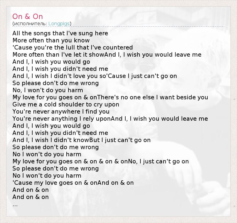 All the songs that I've sung here More often than you know 'Cause you're the lull that I've countered More often than I've let it showAnd I, I wish you would leave me And I, I wish you would go And I, I wish you didn't need me And I, I wish I didn't love you so'Cause I just can't go on So please don't do me wrong No, I won't do you harm My love for you goes on & onThere's no one else I want beside you Give me a cold shoulder to cry upon You're never anywhere I find you You're never anything I rely uponAnd I, I wish you would leave me And I, I wish you would go And I, I wish you didn't need me And I, I wish I didn't knowBut I just can't go on So please don't do me wrong No I won't do you harm My love for you goes on & on & on & onNo, I just can't go on So please don't do me wrong No I won't do you harm 'Cause my love goes on & onAnd on & on And on & on And on & on ...