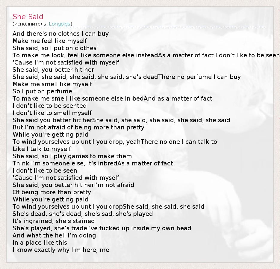 And there's no clothes I can buy Make me feel like myself She said, so I put on clothes To make me look, feel like someone else insteadAs a matter of fact I don't like to be seen 'Cause I'm not satisfied with myself She said, you better hit her She said, she said, she said, she said, she's deadThere no perfume I can buy Make me smell like myself So I put on perfume To make me smell like someone else in bedAnd as a matter of fact I don't like to be scented I don't like to smell myself She said you better hit herShe said, she said, she said, she said, she said But I'm not afraid of being more than pretty While you're getting paid To wind yourselves up until you drop, yeahThere no one I can talk to Like I talk to myself She said, so I play games to make them Think I'm someone else, it's inbredAs a matter of fact I don't like to be seen 'Cause I'm not satisfied with myself She said, you better hit herI'm not afraid Of being more than pretty While you're getting paid To wind yourselves up until you dropShe said, she said, she said She's dead, she's dead, she's sad, she's played It's ingrained, she's stained She's played, she's tradeI've fucked up inside my own head And what the hell I'm doing In a place like this I know exactly why I'm here, me
