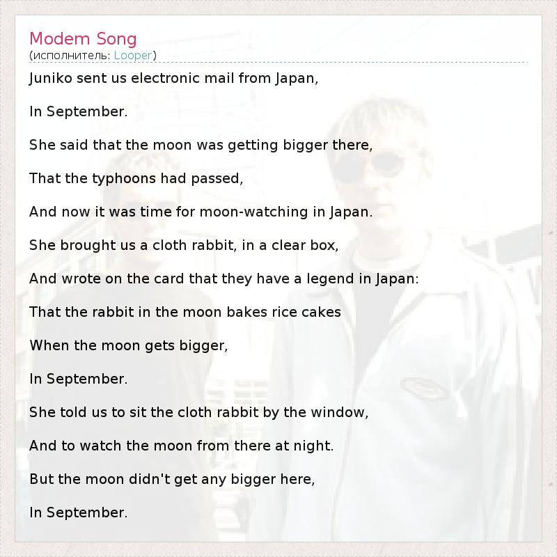 Juniko sent us electronic mail from Japan, In September. She said that the moon was getting bigger there, That the typhoons had passed, And now it was time for moon-watching in Japan. She brought us a cloth rabbit, in a clear box, And wrote on the card that they have a legend in Japan: That the rabbit in the moon bakes rice cakes When the moon gets bigger, In September. She told us to sit the cloth rabbit by the window, And to watch the moon from there at night. But the moon didn't get any bigger here, In September.