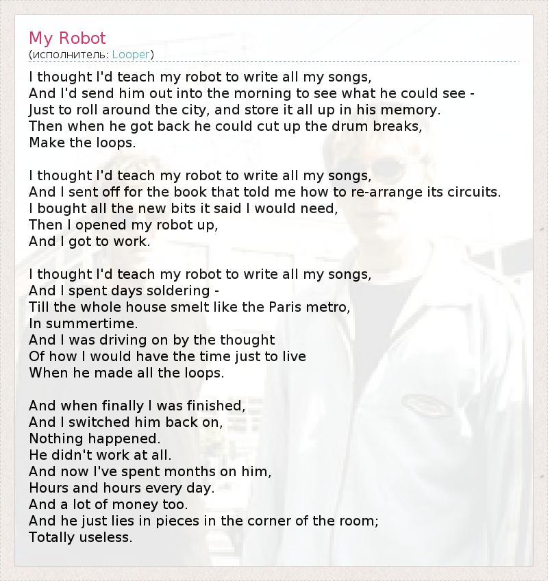 I thought I'd teach my robot to write all my songs, And I'd send him out into the morning to see what he could see - Just to roll around the city, and store it all up in his memory. Then when he got back he could cut up the drum breaks, Make the loops. I thought I'd teach my robot to write all my songs, And I sent off for the book that told me how to re-arrange its circuits. I bought all the new bits it said I would need, Then I opened my robot up, And I got to work. I thought I'd teach my robot to write all my songs, And I spent days soldering - Till the whole house smelt like the Paris metro, In summertime. And I was driving on by the thought Of how I would have the time just to live When he made all the loops. And when finally I was finished, And I switched him back on, Nothing happened. He didn't work at all. And now I've spent months on him, Hours and hours every day. And a lot of money too. And he just lies in pieces in the corner of the room; Totally useless.