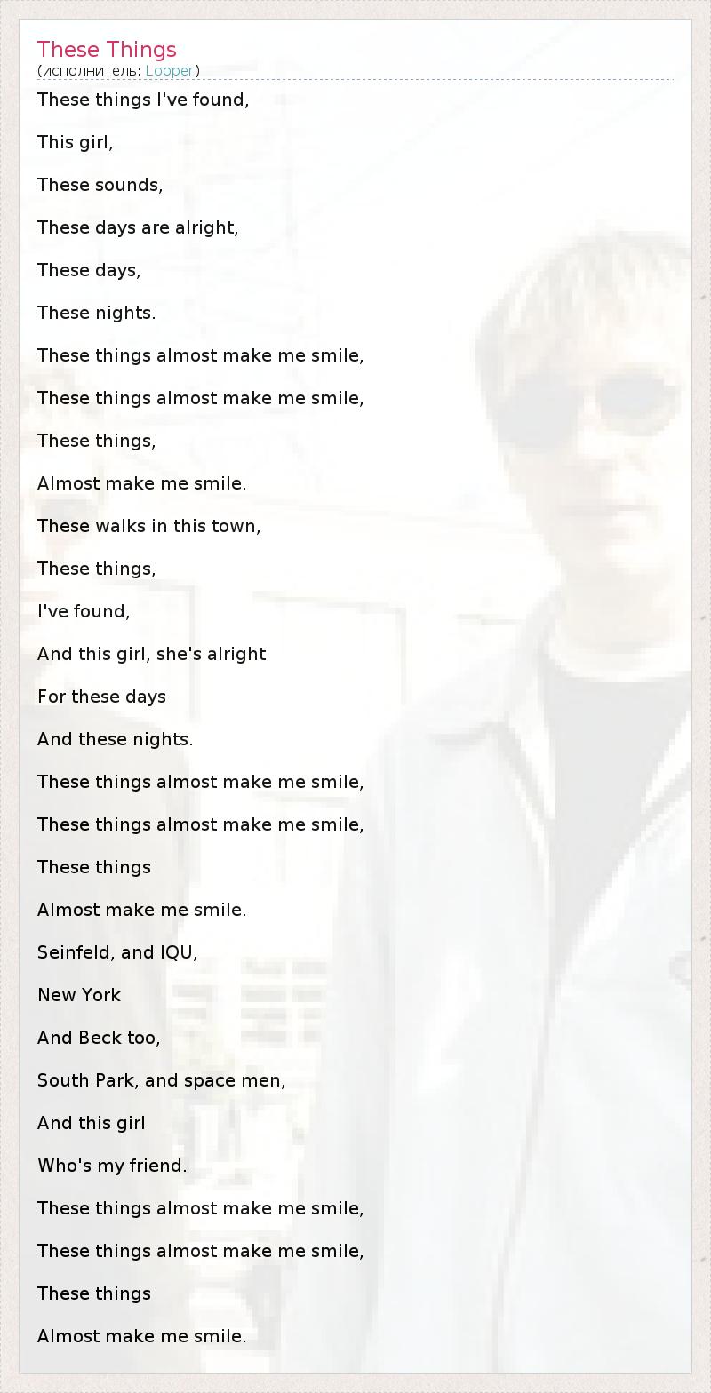 These things I've found, This girl, These sounds, These days are alright, These days, These nights. These things almost make me smile, These things almost make me smile, These things, Almost make me smile. These walks in this town, These things, I've found, And this girl, she's alright For these days And these nights. These things almost make me smile, These things almost make me smile, These things Almost make me smile. Seinfeld, and IQU, New York And Beck too, South Park, and space men, And this girl Who's my friend. These things almost make me smile, These things almost make me smile, These things Almost make me smile.