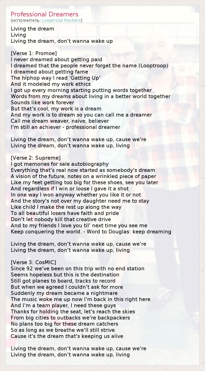 Living the dream Living Living the dream, don't wanna wake up [Verse 1: Promoe] I never dreamed about getting paid I dreamed that the people never forget the name (Looptroop) I dreamed about getting fame The hiphop way I read ‘Getting Up’ And it modeled my work ethics I got up every morning starting putting words together Words from my dreams about living in a better world together Sounds like work forever But that's cool, my work is a dream And my work is to dream so you can call me a dreamer Call me dream weaver, naive, believer I'm still an achiever - professional dreamer Living the dream, don't wanna wake up, cause we're Living the dream, don't wanna wake up, living [Verse 2: Supreme] I got memories for sale autobiography Everything that's real now started as somebody's dream A vision of the future, notes on a wrinkled piece of paper Like my feet getting too big for these shoes, see you later And regardless if I win or loose I gave it a shot In one way I won anyway whether you like it or not And the story's not over my daughter need me to stay Like child I make the rest up along the way To all beautiful losers have faith and pride Don't let nobody kill that creative drive And to my friends I love you til' next time you see me Keep conquering the world. - Word to Douglas: keep dreaming Living the dream, don't wanna wake up, cause we're Living the dream, don't wanna wake up, living [Verse 3: CosMIC] Since 92 we've been on this trip with no end station Seems hopeless but this is the destination Still got planes to board, tracks to record But when we agreed I couldn't ask for more Suddenly my dream became a nightmare The music woke me up now I'm back in this right here And I'm a team player, I need these guys Thanks for holding the seat, let's reach the skies From big cities to outbacks we're backpackers No plans too big for these dream catchers So as long as we breathe we'll still strive Cause it's the dream that's keeping us alive Living the dream, don't wanna wake up, cause we're Living the dream, don't wanna wake up, living