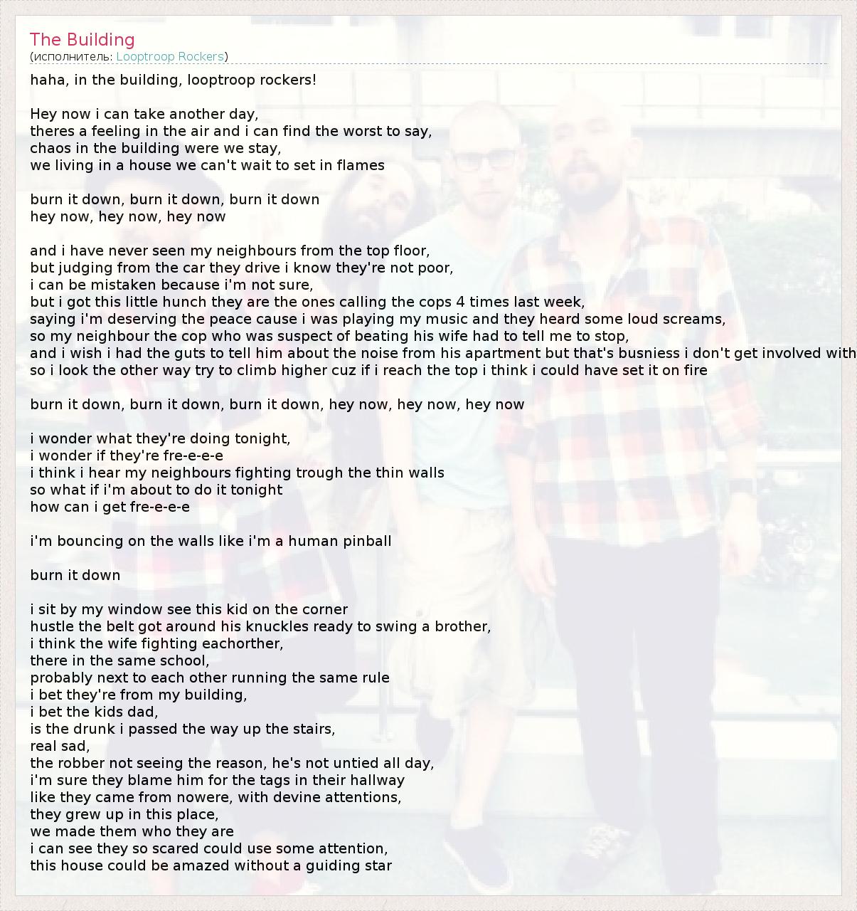 haha, in the building, looptroop rockers! Hey now i can take another day, theres a feeling in the air and i can find the worst to say, chaos in the building were we stay, we living in a house we can't wait to set in flames burn it down, burn it down, burn it down hey now, hey now, hey now and i have never seen my neighbours from the top floor, but judging from the car they drive i know they're not poor, i can be mistaken because i'm not sure, but i got this little hunch they are the ones calling the cops 4 times last week, saying i'm deserving the peace cause i was playing my music and they heard some loud screams, so my neighbour the cop who was suspect of beating his wife had to tell me to stop, and i wish i had the guts to tell him about the noise from his apartment but that's busniess i don't get involved with so i look the other way try to climb higher cuz if i reach the top i think i could have set it on fire burn it down, burn it down, burn it down, hey now, hey now, hey now i wonder what they're doing tonight, i wonder if they're fre-e-e-e i think i hear my neighbours fighting trough the thin walls so what if i'm about to do it tonight how can i get fre-e-e-e i'm bouncing on the walls like i'm a human pinball burn it down i sit by my window see this kid on the corner hustle the belt got around his knuckles ready to swing a brother, i think the wife fighting eachorther, there in the same school, probably next to each other running the same rule i bet they're from my building, i bet the kids dad, is the drunk i passed the way up the stairs, real sad, the robber not seeing the reason, he's not untied all day, i'm sure they blame him for the tags in their hallway like they came from nowere, with devine attentions, they grew up in this place, we made them who they are i can see they so scared could use some attention, this house could be amazed without a guiding star