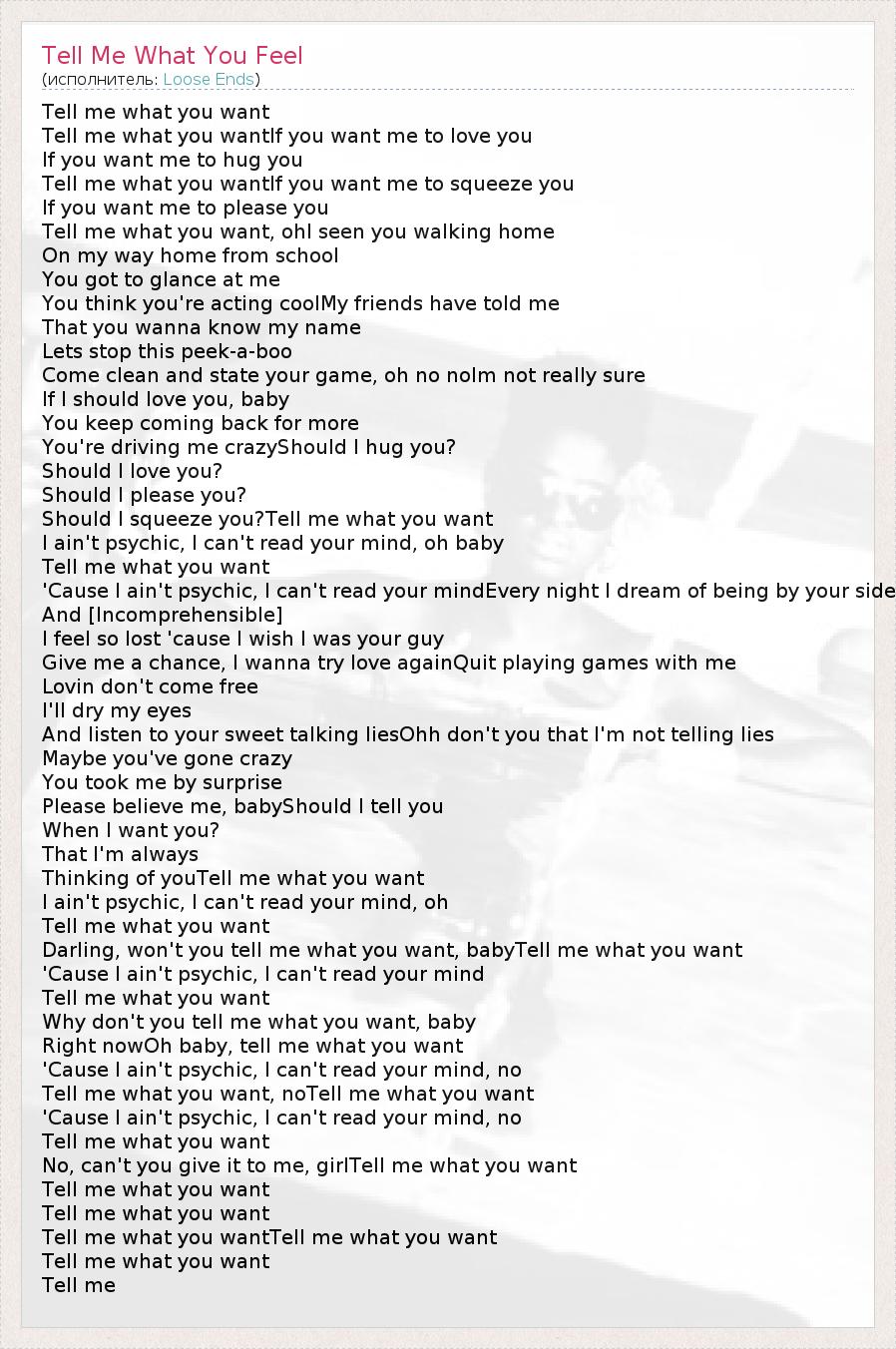 Tell me what you want Tell me what you wantIf you want me to love you If you want me to hug you Tell me what you wantIf you want me to squeeze you If you want me to please you Tell me what you want, ohI seen you walking home On my way home from school You got to glance at me You think you're acting coolMy friends have told me That you wanna know my name Lets stop this peek-a-boo Come clean and state your game, oh no noIm not really sure If I should love you, baby You keep coming back for more You're driving me crazyShould I hug you? Should I love you? Should I please you? Should I squeeze you?Tell me what you want I ain't psychic, I can't read your mind, oh baby Tell me what you want 'Cause I ain't psychic, I can't read your mindEvery night I dream of being by your side And [Incomprehensible] I feel so lost 'cause I wish I was your guy Give me a chance, I wanna try love againQuit playing games with me Lovin don't come free I'll dry my eyes And listen to your sweet talking liesOhh don't you that I'm not telling lies Maybe you've gone crazy You took me by surprise Please believe me, babyShould I tell you When I want you? That I'm always Thinking of youTell me what you want I ain't psychic, I can't read your mind, oh Tell me what you want Darling, won't you tell me what you want, babyTell me what you want 'Cause I ain't psychic, I can't read your mind Tell me what you want Why don't you tell me what you want, baby Right nowOh baby, tell me what you want 'Cause I ain't psychic, I can't read your mind, no Tell me what you want, noTell me what you want 'Cause I ain't psychic, I can't read your mind, no Tell me what you want No, can't you give it to me, girlTell me what you want Tell me what you want Tell me what you want Tell me what you wantTell me what you want Tell me what you want Tell me