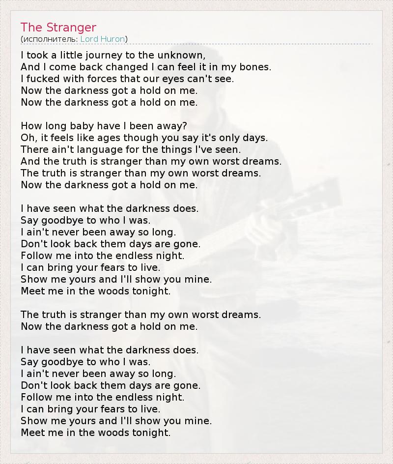 I took a little journey to the unknown, And I come back changed I can feel it in my bones. I fucked with forces that our eyes can't see. Now the darkness got a hold on me. Now the darkness got a hold on me. How long baby have I been away? Oh, it feels like ages though you say it's only days. There ain't language for the things I've seen. And the truth is stranger than my own worst dreams. The truth is stranger than my own worst dreams. Now the darkness got a hold on me. I have seen what the darkness does. Say goodbye to who I was. I ain't never been away so long. Don't look back them days are gone. Follow me into the endless night. I can bring your fears to live. Show me yours and I'll show you mine. Meet me in the woods tonight. The truth is stranger than my own worst dreams. Now the darkness got a hold on me. I have seen what the darkness does. Say goodbye to who I was. I ain't never been away so long. Don't look back them days are gone. Follow me into the endless night. I can bring your fears to live. Show me yours and I'll show you mine. Meet me in the woods tonight.
