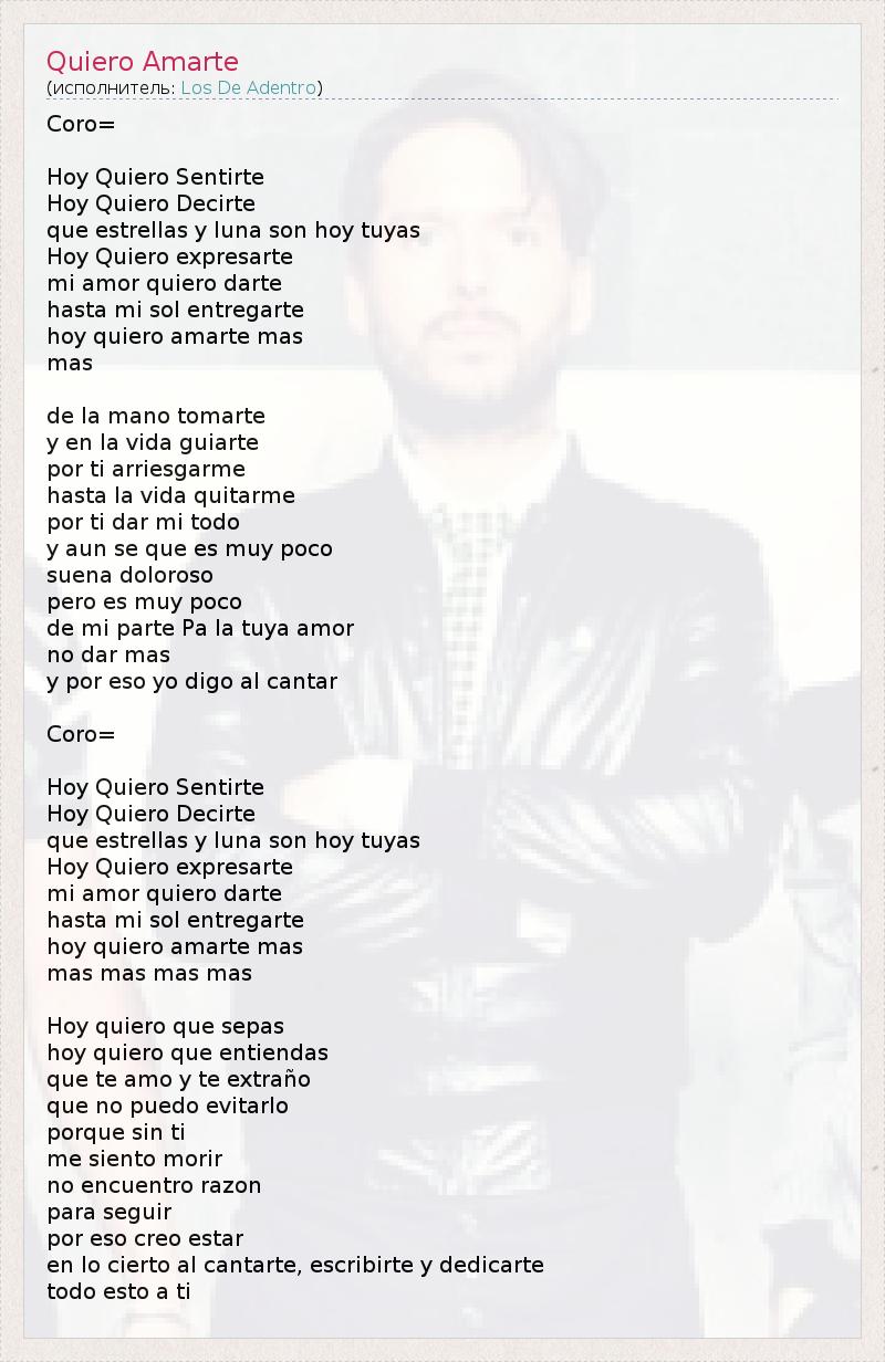 Коро = Хой Quiero Sentirte Хой Quiero Decirte дие Estrellas у Luna сын Hoy tuyas Хой Quiero expresarte Mi Amor Quiero darte хаста миль золь entregarte хой Quiero Amarte Рождество Рождество де-ла- мано tomarte у ан La Vida guiarte POR ти arriesgarme хаста La Vida quitarme POR ти дар миль TODO у Аун себе дие эс Muy Poco Suena Doloroso Перо -эс Muy Poco де миль одностороннем порядке Па ла Туя амор нет дар Рождество у POR ESO лет Digo др. Cantar Коро = Хой Quiero Sentirte Хой Quiero Decirte дие Estrellas у Luna сын Hoy tuyas Хой Quiero expresarte Mi Amor Quiero darte хаста миль золь entregarte хой Quiero Amarte Рождество Mas Mas Mas Рождество Хой Quiero дие SEPAS хой Quiero дие entiendas Que Te Amo у тэ extraño дие нет puedo evitarlo Porque грех ти мне Siento Morir нет Encuentro Разон пункт seguir POR ESO Creo ЭСТАР ан вот cierto др. cantarte , escribirte у dedicarte TODO Эстоти