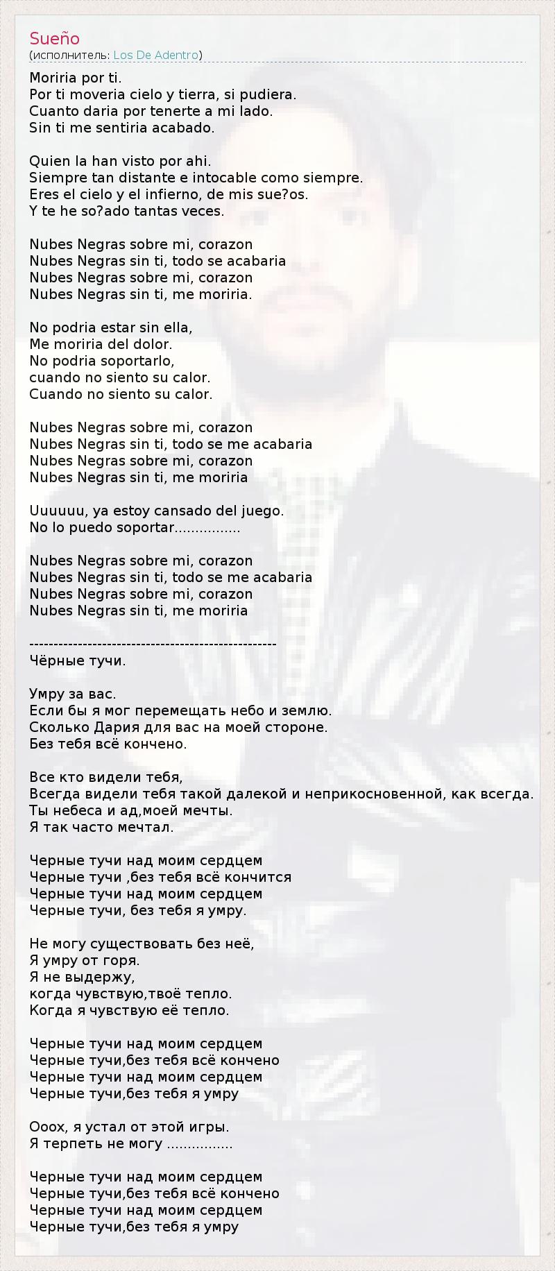 Moriria por ti. Por ti moveria cielo y tierra, si pudiera. Cuanto daria por tenerte a mi lado. Sin ti me sentiria acabado. Quien la han visto por ahi. Siempre tan distante e intocable como siempre. Eres el cielo y el infierno, de mis sue?os. Y te he so?ado tantas veces. Nubes Negras sobre mi, corazon Nubes Negras sin ti, todo se acabaria Nubes Negras sobre mi, corazon Nubes Negras sin ti, me moriria. No podria estar sin ella, Me moriria del dolor. No podria soportarlo, cuando no siento su calor. Cuando no siento su calor. Nubes Negras sobre mi, corazon Nubes Negras sin ti, todo se me acabaria Nubes Negras sobre mi, corazon Nubes Negras sin ti, me moriria Uuuuuu, ya estoy cansado del juego. No lo puedo soportar................ Nubes Negras sobre mi, corazon Nubes Negras sin ti, todo se me acabaria Nubes Negras sobre mi, corazon Nubes Negras sin ti, me moriria --------------------------------------------------- Чёрные тучи. Умру за вас. Если бы я мог перемещать небо и землю. Сколько Дария для вас на моей стороне. Без тебя всё кончено. Все кто видели тебя, Всегда видели тебя такой далекой и неприкосновенной, как всегда. Ты небеса и ад,моей мечты. Я так часто мечтал. Черные тучи над моим сердцем Черные тучи ,без тебя всё кончится Черные тучи над моим сердцем Черные тучи, без тебя я умру. Не могу существовать без неё, Я умру от горя. Я не выдержу, когда чувствую,твоё тепло. Когда я чувствую её тепло. Черные тучи над моим сердцем Черные тучи,без тебя всё кончено Черные тучи над моим сердцем Черные тучи,без тебя я умру Oooх, я устал от этой игры. Я терпеть не могу ................ Черные тучи над моим сердцем Черные тучи,без тебя всё кончено Черные тучи над моим сердцем Черные тучи,без тебя я умру