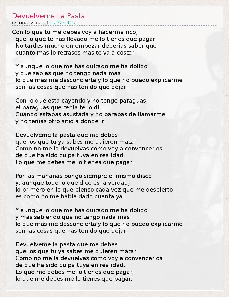 А как ты думаешь, о чем песня "Devuelveme La Pasta" ?