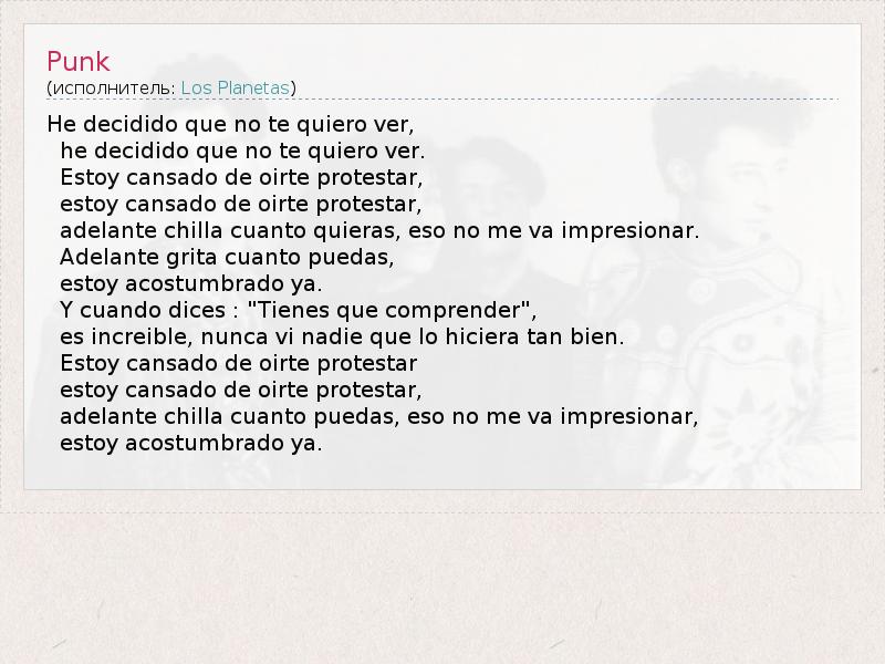 Это интересно:Испанская инди-рок группа «Los Planetas» (Планеты) была основана в 1993г. в Гранаде. Состав группы несколько раз менялся, сегодня в коллектив входят вокалист/гитарист Juan Ramón Rodríguez Cervilla, гитарист Florentino Muñoz Lozano, барабанщик Ernesto Jiménez Linares, клавишник Esteban Fraile Maldonado и басист Julián Méndez Podadera. Первым хитом «Los Planetas» стала песня «Qué puedo hacer» из дебютного альбома исполнителей «Super 8», записанного на студии «RCA-BMG... продолжение