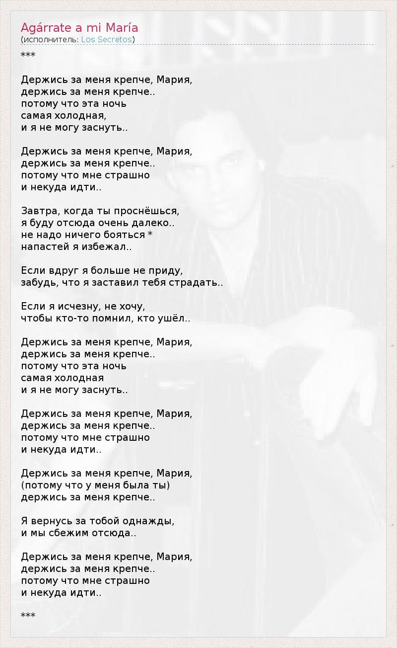 *** Держись за меня крепче, Мария, держись за меня крепче.. потому что эта ночь самая холодная, и я не могу заснуть.. Держись за меня крепче, Мария, держись за меня крепче.. потому что мне страшно и некуда идти.. Завтра, когда ты проснёшься, я буду отсюда очень далеко.. не надо ничего бояться * напастей я избежал.. Если вдруг я больше не приду, забудь, что я заставил тебя страдать.. Если я исчезну, не хочу, чтобы кто-то помнил, кто ушёл.. Держись за меня крепче, Мария, держись за меня крепче.. потому что эта ночь самая холодная и я не могу заснуть.. Держись за меня крепче, Мария, держись за меня крепче.. потому что мне страшно и некуда идти.. Держись за меня крепче, Мария, (потому что у меня была ты) держись за меня крепче.. Я вернусь за тобой однажды, и мы сбежим отсюда.. Держись за меня крепче, Мария, держись за меня крепче.. потому что мне страшно и некуда идти.. ***