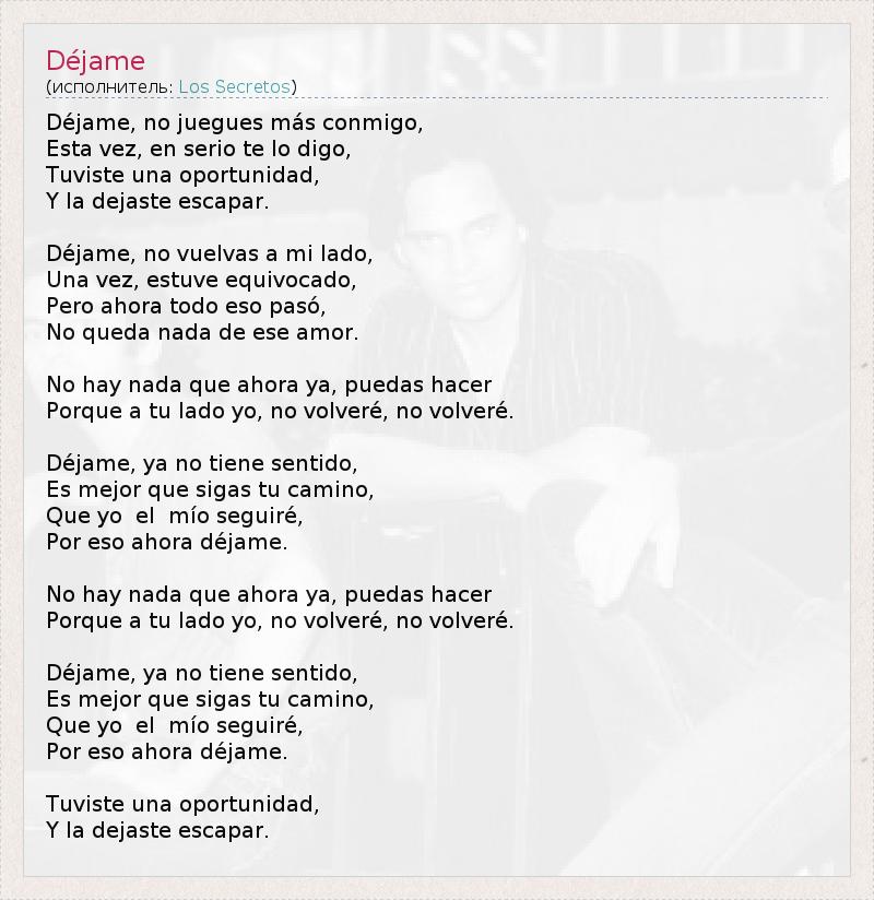 Оставь меня, не играй со мной больше, На этот раз я тебе серьёзно говорю, У тебя был шанс, Но ты его упустила. Оставь меня, не возвращайся ко мне, Однажды я ошибся, Но сейчас всё прошло, Не осталось ничего от этой любви. Ты ничего уже не можешь сделать, Потому что к тебе я не вернусь, не вернусь. Оставь меня, уже нет смысла, Лучше тебе пойти своей дорогой, А я пойду своей, Поэтому прямо сейчас оставь меня. Ты ничего уже не можешь сделать, Потому что к тебе я не вернусь, не вернусь. Оставь меня, уже нет смысла, Лучше тебе пойти своей дорогой, А я пойду своей, Поэтому прямо сейчас оставь меня. У тебя был шанс, Но ты его упустила.
