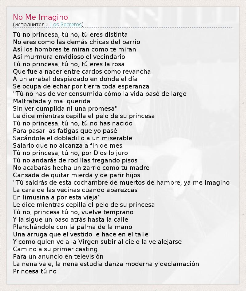 Tú no princesa, tú no, tú eres distinta No eres como las demás chicas del barrio Así los hombres te miran como te miran Así murmura envidioso el vecindario Tú no princesa, tú no, tú eres la rosa Que fue a nacer entre cardos como revancha A un arrabal despiadado en donde el día Se ocupa de echar por tierra toda esperanza "Tú no has de ver consumida cómo la vida pasó de largo Maltratada y mal querida Sin ver cumplida ni una promesa" Le dice mientras cepilla el pelo de su princesa Tú no princesa, tú no, tú no has nacido Para pasar las fatigas que yo pasé Sacándole el dobladillo a un miserable Salario que no alcanza a fin de mes Tú no princesa, tú no, por Dios lo juro Tú no andarás de rodillas fregando pisos No acabarás hecha un zarrio como tu madre Cansada de quitar mierda y de parir hijos "Tú saldrás de esta cochambre de muertos de hambre, ya me imagino La cara de las vecinas cuando aparezcas En limusina a por esta vieja" Le dice mientras cepilla el pelo de su princesa Tú no, princesa tú no, vuelve temprano Y la sigue un paso atrás hasta la calle Planchándole con la palma de la mano Una arruga que el vestido le hace en el talle Y como quien ve a la Virgen subir al cielo la ve alejarse Camino a su primer casting Para un anuncio en televisión La nena vale, la nena estudia danza moderna y declamación Princesa tú no