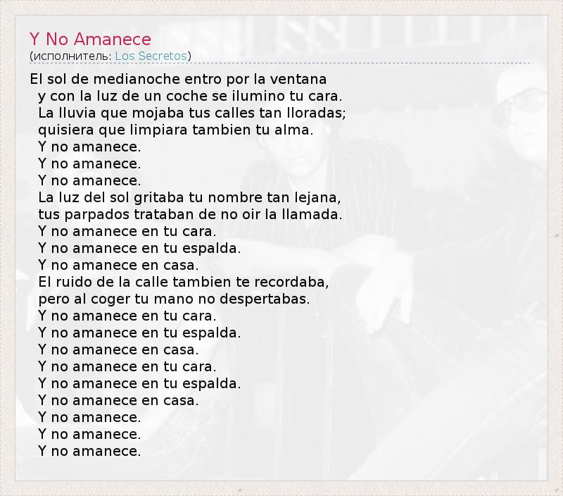 El sol de medianoche entro por la ventana y con la luz de un coche se ilumino tu cara. La lluvia que mojaba tus calles tan lloradas; quisiera que limpiara tambien tu alma. Y no amanece. Y no amanece. Y no amanece. La luz del sol gritaba tu nombre tan lejana, tus parpados trataban de no oir la llamada. Y no amanece en tu cara. Y no amanece en tu espalda. Y no amanece en casa. El ruido de la calle tambien te recordaba, pero al coger tu mano no despertabas. Y no amanece en tu cara. Y no amanece en tu espalda. Y no amanece en casa. Y no amanece en tu cara. Y no amanece en tu espalda. Y no amanece en casa. Y no amanece. Y no amanece. Y no amanece.