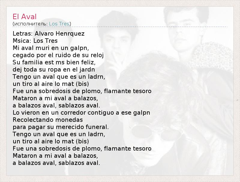 Letras: Alvaro Henrquez Msica: Los Tres Mi aval muri en un galpn, cegado por el ruido de su reloj Su familia est ms bien feliz, dej toda su ropa en el jardn Tengo un aval que es un ladrn, un tiro al aire lo mat (bis) Fue una sobredosis de plomo, flamante tesoro Mataron a mi aval a balazos, a balazos aval, sablazos aval. Lo vieron en un corredor contiguo a ese galpn Recolectando monedas para pagar su merecido funeral. Tengo un aval que es un ladrn, un tiro al aire lo mat (bis) Fue una sobredosis de plomo, flamante tesoro Mataron a mi aval a balazos, a balazos aval, sablazos aval.