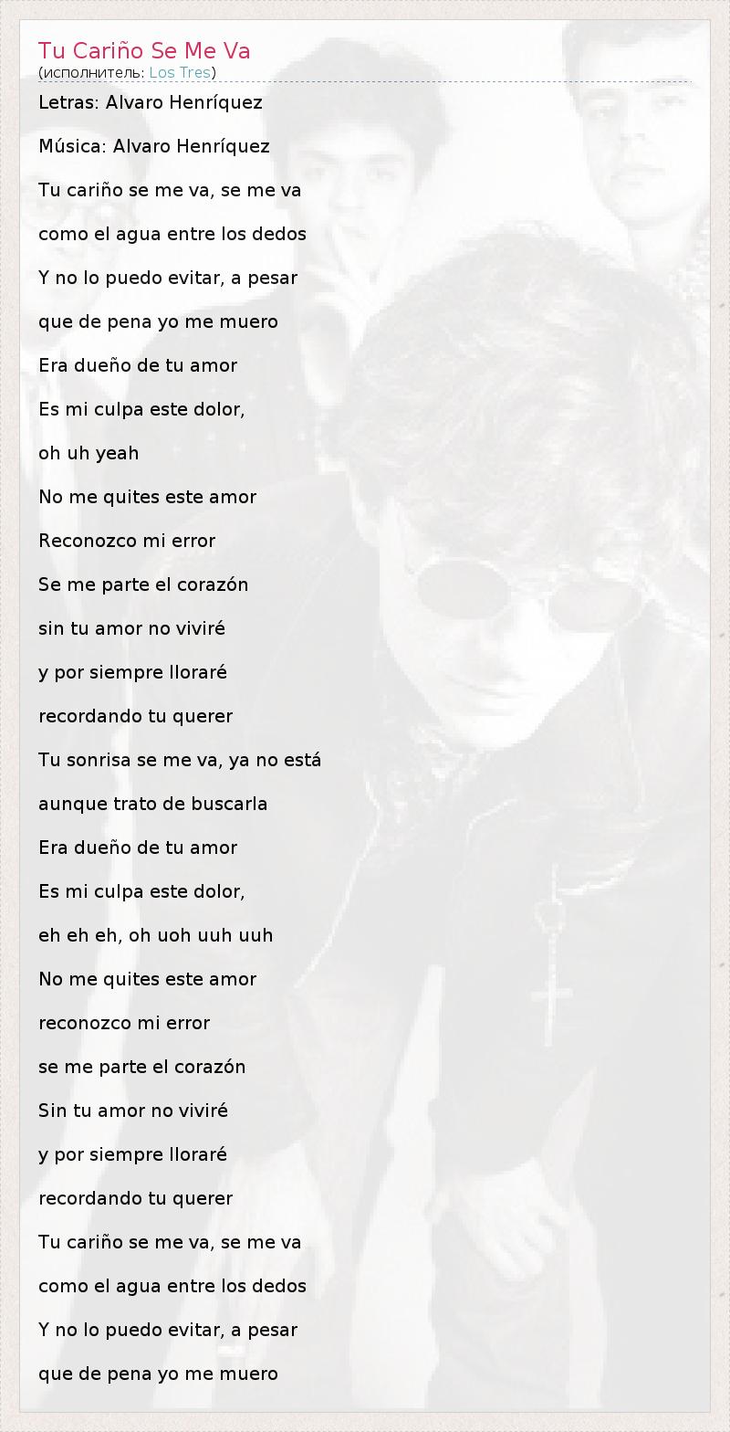 Letras: Alvaro Henríquez Música: Alvaro Henríquez Tu cariño se me va, se me va como el agua entre los dedos Y no lo puedo evitar, a pesar que de pena yo me muero Era dueño de tu amor Es mi culpa este dolor, oh uh yeah No me quites este amor Reconozco mi error Se me parte el corazón sin tu amor no viviré y por siempre lloraré recordando tu querer Tu sonrisa se me va, ya no está aunque trato de buscarla Era dueño de tu amor Es mi culpa este dolor, eh eh eh, oh uoh uuh uuh No me quites este amor reconozco mi error se me parte el corazón Sin tu amor no viviré y por siempre lloraré recordando tu querer Tu cariño se me va, se me va como el agua entre los dedos Y no lo puedo evitar, a pesar que de pena yo me muero