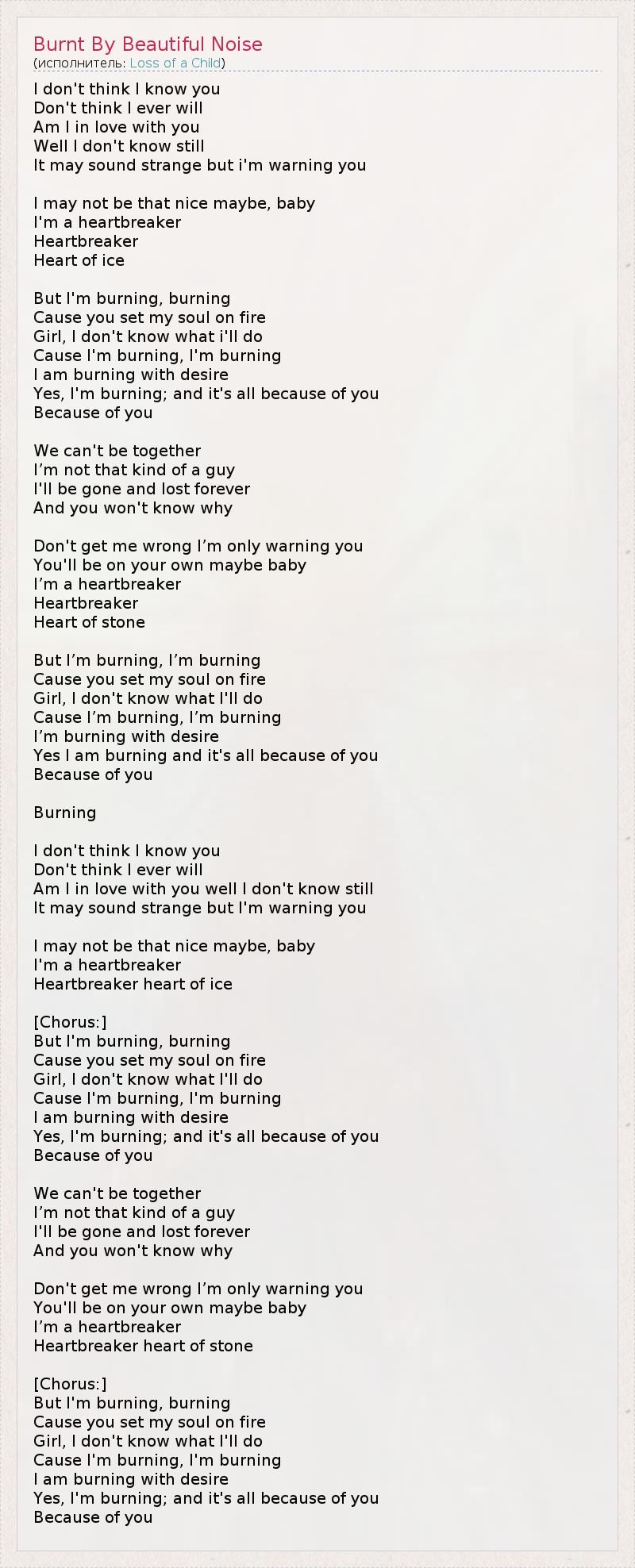 Я не уверен, что знаю тебя, И не уверен, что когда-то узнаю. Я влюблён в тебя, Хотя до сих пор не уверен. Это может показаться странным, но я предупреждаю тебя: Я могу и не быть тем милым, детка, Я разбиваю сердца, Разбиваю сердца, Моё сердце изо льда... Но я сгораю, сгораю, Потому что ты зажгла моё сердце. Девочка, я не знаю, что я буду делать, Потому что я сгораю, сгораю, Я сгораю от желания... Да, я сгораю, и всё из-за тебя, Из-за тебя... Мы не можем быть вместе, Я не тот тип парней. Я уйду и пропаду навсегда, И ты не узнаешь, почему. Пойми меня правильно – я просто предупреждаю тебя. Ты, возможно, останешься одна, Ведь я разбиваю сердца, Разбиваю сердца, Моё сердце из камня... Но я сгораю, сгораю, Потому что ты зажгла моё сердце. Девочка, я не знаю, что я буду делать, Потому что я сгораю, сгораю, Я сгораю от желания... Да, я сгораю, и всё из-за тебя, Из-за тебя... Сгораю (перевод Марины Рябиковой из Нижнего Новгорода) Ты меня не знаешь И вряд ли разгадаешь. А любви во мне мало Время не настало. Может быть это странно, я иду до конца. Знаешь, детка, это так, просто, так просто - Красть сердца... [Припев:] Я сгораю, сгораю, Ты пожар в душе развела, Страсть тело обожгла... Я сгораю, сгораю, Эта ночь без тебя длинна. Я сгораю - в этом вся твоя вина, Твоя вина... Нам не быть вместе, Это ведь не к чему. А когда я исчезну, Не поймешь, почему... Ты мне лгать не пытайся, Ты не скроешь лица. Знаешь, детка, это так, просто, так просто Красть сердца... [Припев:] Я сгораю, сгораю, Ты пожар в душе развела, Страсть тело обожгла... Я сгораю, сгораю, Эта ночь без тебя длинна. Я сгораю - в этом вся твоя вина, Твоя вина...