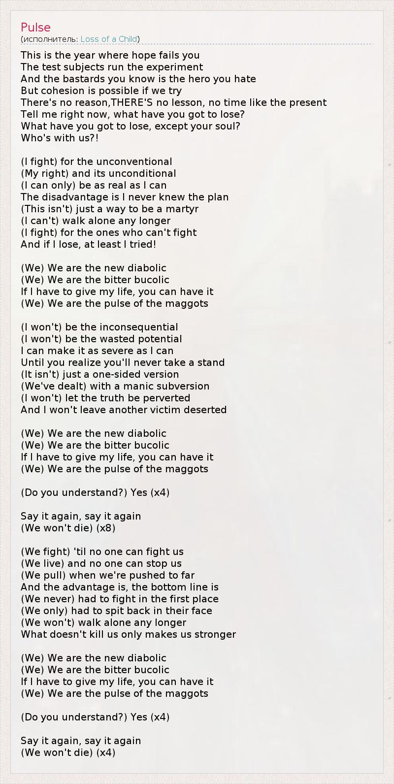 Это год, когда надежда оставит вас. Подопытные ставят эксперименты, А ублюдок, которого вы знаете,- герой, которого вы ненавидите. Но мы можем быть едины, если постараемся. Никаких причин, НИКАКИХ уроков, живём только настоящим моментом. Скажите мне прямо сейчас: что вам терять? Что вам терять, кроме души? Кто с нами?! (Я борюсь) за жизнь без шаблонов. (Моё право) и оно безусловно. (Я могу только) быть самим собой, И неудобство в том, что я никогда не знал плана. (Не выход) быть просто мучеником, (Я больше не могу) идти в одиночку. (Я борюсь) за тех, кто бороться не может. И даже если я проиграю – я хотя бы старался! (Мы) Мы новая дьявольские сила. (Мы) Мы воплощение горькой сельской жизни. Если мне надо отдать свою жизнь, вы можете забрать её. (Мы) Мы пульс мэгготов! (Я не) буду алогичен, (Я не) буду потерянным потенциалом. Я могу сделать жизнь такой суровой, какой я могу её сделать, Пока вы не поймёте, что у вас не будет шансов. (Это не) просто одна сторона медали, (Мы имели дело) с маниакальным низвержением. (Я не позволю), чтобы правду извратили, И я не оставлю ещё одну жертву в одиночестве. (Мы) Мы новая дьявольские сила. (Мы) Мы воплощение горькой сельской жизни. Если мне надо отдать свою жизнь, вы можете забрать её. (Мы) Мы пульс мэгготов! (Вы понимаете?) Да (x4) Скажите ещё раз, скажите ещё раз (Мы не умрём) (x8) (Мы боремся), пока никто не сможет нас побороть, (Мы живём) и никто нас не остановит! (Мы рвёмся), когда нас оттолкнули, И преимущество в том, что дно есть. (Нам никогда) не приходилось сражаться на первом месте. (Нам только) приходилось плевать им обратно в лица. (Мы больше не) будем ходить в одиночку. То, что нас не убивает, делает нас лишь сильнее! (Мы) Мы новая дьявольские сила. (Мы) Мы воплощение горькой сельской жизни. Если мне надо отдать свою жизнь, вы можете забрать её. (Мы) Мы пульс мэгготов! (Вы понимаете?) Да (x4) Скажите ещё раз, скажите ещё раз (Мы не умрём) (x4) * - фанаты Slipknot (прим. переводчика)