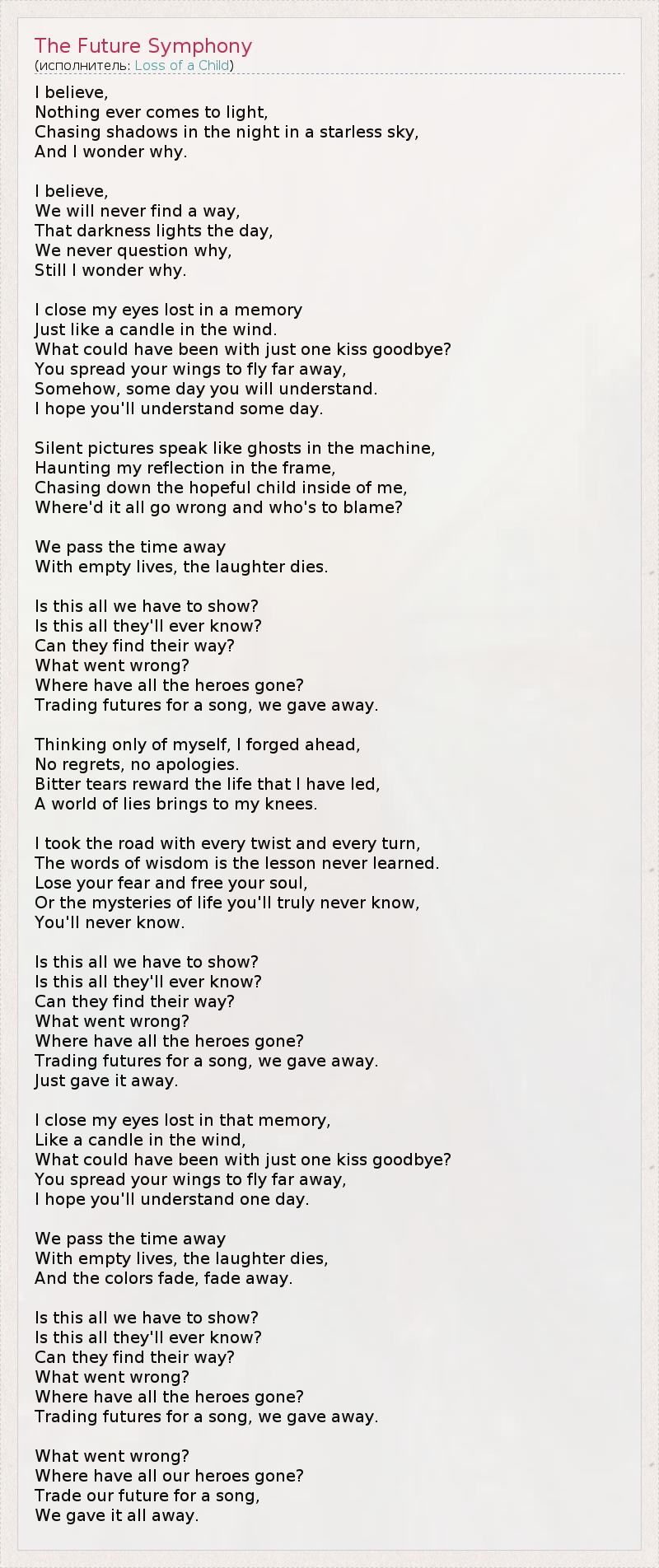 Я полагаю, Что ничего никогда не станет известно, Я гоняюсь за тенями в ночном беззвёздном небе И я спрашиваю себя, зачем? Я полагаю, Мы никогда не найдём выхода, Эта тьма осветит день, Мы никогда не задаёмся вопросом, зачем всё это? Но я по-прежнему спрашиваю себя об этом? Я закрываю глаза, заблудившись в своих воспоминаниях, Словно свеча на ветру. Всего один прощальный поцелуй, и как могло бы всё сейчас быть? Ты распустила крылья и улетела далеко, Как-нибудь когда-нибудь ты поймёшь. Я надеюсь, что когда-нибудь ты поймёшь. Безмолвные рисунки разговаривают со мной с картины, как призраки, Преследуют моё отражение в рамке, Они разбивают ребяческие надежды в глубине моей души, Когда мы совершили ощибку, и кто в этом виноват? Мы просто теряем время, Наши жизни пусты, и смех затихает. Это всё, что мы должны объяснить? Это всё, о чём они когда-либо узнают? Могут ли они обрести свой путь? В чём мы ошиблись? Куда подевались все герои? Продав своё будущее за бесценок, мы лишили себя надежды на лучшее. Думая лишь о себе, я вырвался вперёд, Без сожалений, ни перед кем не извиняясь. Горькие слёзы - вот награда за жизнь, которую я вёл, Лживый мир почти сломил меня. Я прошёл свой путь со всеми его изгибами и поворотами, Мне говорили умные вещи, но я так и не выучил этот урок. Отпусти свои страхи и освободи душу, Или ты никогда не узнаешь по-настощему тайн жизни, Ты никогда не узнаешь. Это всё, что мы должны объяснить? Это всё, о чём они когда-либо узнают? Могут ли они обрести свой путь? В чём мы ошиблись? Куда подевались все герои? Продав своё будущее за бесценок, мы лишили себя надежды на лучшее. Просто лишили себя надежды на лучшее. Я закрываю глаза, заблудившись в тех своих воспоминаниях, Словно свеча на ветру. Всего один прощальный поцелуй, и как могло бы всё сейчас быть? Ты распустила крылья и улетела далеко, Я надеюсь, что однажды ты поймёшь. Мы просто теряем время, Наши жизни пусты, и смех затихает, И цвета становятся всё более тусклыми. Это всё, что мы должны объяснить? Это всё, о чём они когда-либо узнают? Могут ли они обрести свой путь? В чём мы ошиблись? Куда подевались все герои? Продав своё будущее за бесценок, мы лишили себя надежды на лучшее. В чём мы ошиблись? Куда подевались все наши герои? Мы продали своё будущее за бесценок, Мы лишили себя всяческой надежды на лучшее.