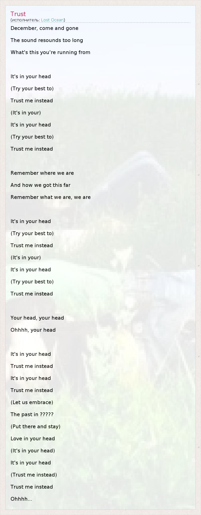 Это интересно:Lost Ocean - христианская рок-группа из Бейкерсфилда (Калифорния, США); в настоящее время они инди-группа, так как контракт с лейблом был закончен в начале 2009 года. Они выпустили 2 EP-альбома, а также полноценный студийный дебютник в 2007 году, а в июне 2009 издали свой первый самостоятельный инди-релиз "All Our Friends - EP". В ноябре того же года вышел их второй студийный альбом - "Could This Be Love?".... продолжение