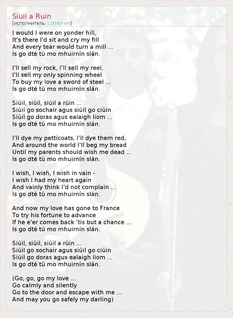 I would I were on yonder hill, It's there I'd sit and cry my fill And every tear would turn a mill ... Is go dté tú mo mhuirnín slán. I'll sell my rock, I'll sell my reel, I'll sell my only spinning wheel To buy my love a sword of steel ... Is go dté tú mo mhuirnín slán. Siúil, siúil, siúil a rúin ... Siúil go sochair agus siúil go ciúin Siúil go doras agus ealaigh liom ... Is go dté tú mo mhuirnín slán. I'll dye my petticoats, I'll dye them red, And around the world I'll beg my bread Until my parents should wish me dead ... Is go dté tú mo mhuirnín slán. I wish, I wish, I wish in vain - I wish I had my heart again And vainly think I'd not complain ... Is go dté tú mo mhuirnín slán. And now my love has gone to France To try his fortune to advance If he e'er comes back 'tis but a chance ... Is go dté tú mo mhuirnín slán. Siúil, siúil, siúil a rúin ... Siúil go sochair agus siúil go ciúin Siúil go doras agus ealaigh liom ... Is go dté tú mo mhuirnín slán. (Go, go, go my love ... Go calmly and silently Go to the door and escape with me ... And may you go safely my darling)