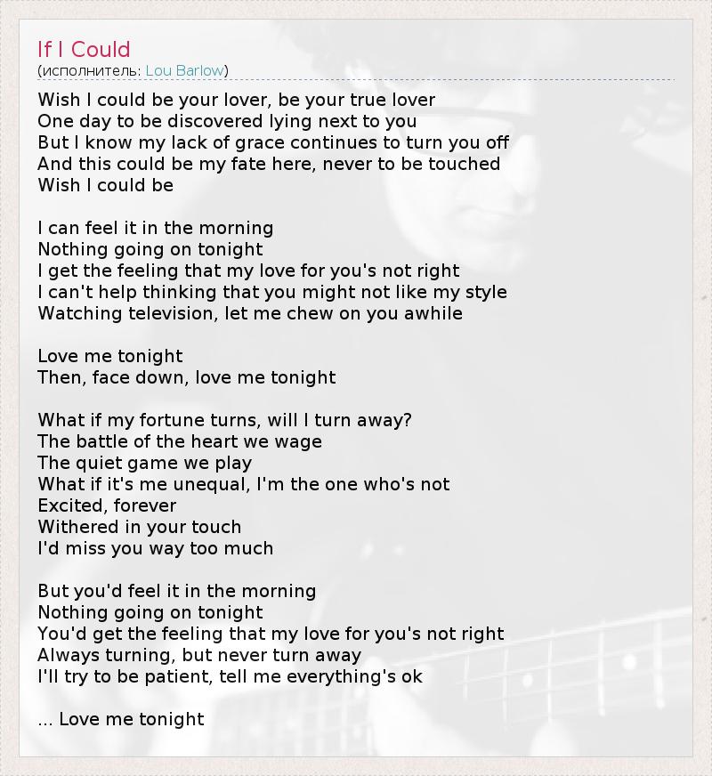 Wish I could be your lover, be your true lover One day to be discovered lying next to you But I know my lack of grace continues to turn you off And this could be my fate here, never to be touched Wish I could be I can feel it in the morning Nothing going on tonight I get the feeling that my love for you's not right I can't help thinking that you might not like my style Watching television, let me chew on you awhile Love me tonight Then, face down, love me tonight What if my fortune turns, will I turn away? The battle of the heart we wage The quiet game we play What if it's me unequal, I'm the one who's not Excited, forever Withered in your touch I'd miss you way too much But you'd feel it in the morning Nothing going on tonight You'd get the feeling that my love for you's not right Always turning, but never turn away I'll try to be patient, tell me everything's ok ... Love me tonight