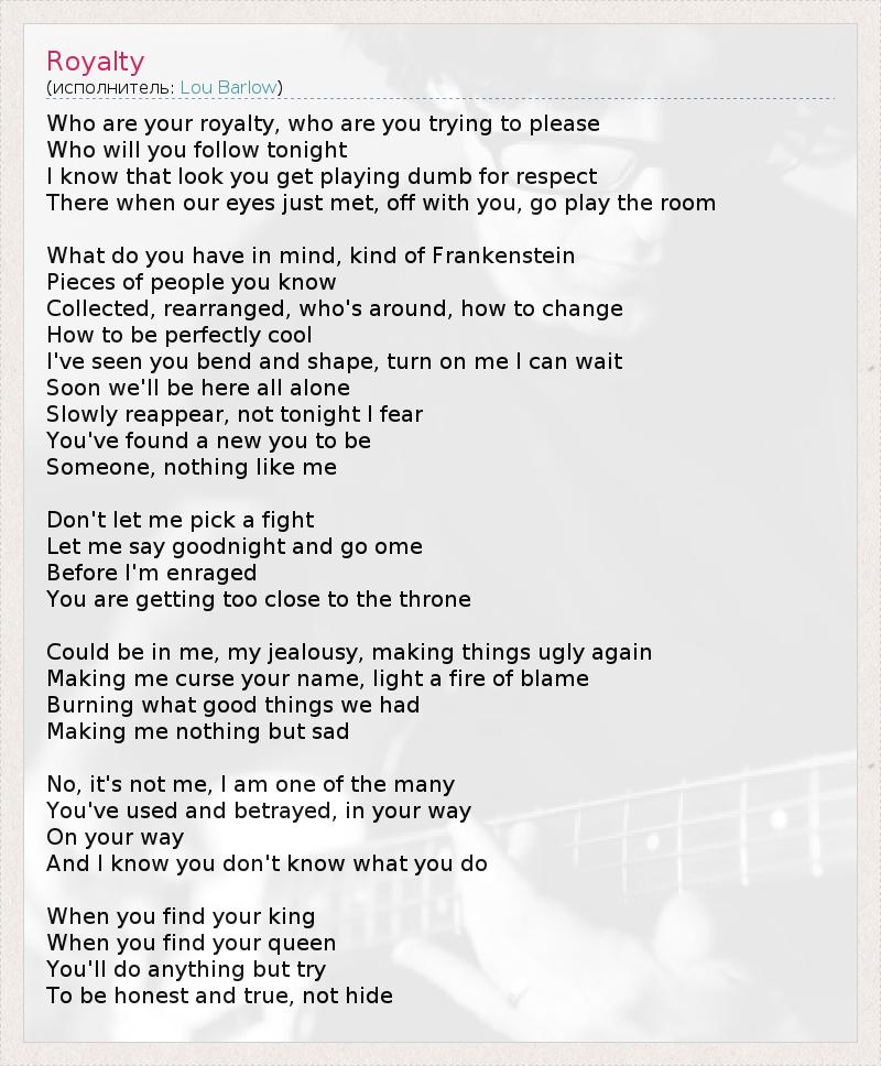 Who are your royalty, who are you trying to please Who will you follow tonight I know that look you get playing dumb for respect There when our eyes just met, off with you, go play the room What do you have in mind, kind of Frankenstein Pieces of people you know Collected, rearranged, who's around, how to change How to be perfectly cool I've seen you bend and shape, turn on me I can wait Soon we'll be here all alone Slowly reappear, not tonight I fear You've found a new you to be Someone, nothing like me Don't let me pick a fight Let me say goodnight and go ome Before I'm enraged You are getting too close to the throne Could be in me, my jealousy, making things ugly again Making me curse your name, light a fire of blame Burning what good things we had Making me nothing but sad No, it's not me, I am one of the many You've used and betrayed, in your way On your way And I know you don't know what you do When you find your king When you find your queen You'll do anything but try To be honest and true, not hide