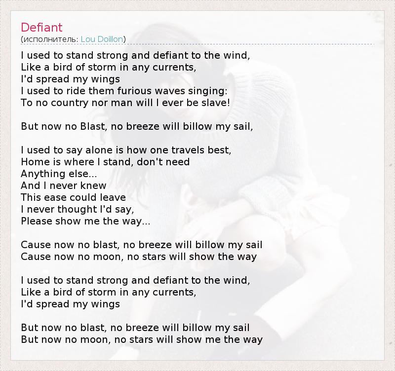 I used to stand strong and defiant to the wind, Like a bird of storm in any currents, I'd spread my wings I used to ride them furious waves singing: To no country nor man will I ever be slave! But now no Blast, no breeze will billow my sail, I used to say alone is how one travels best, Home is where I stand, don't need Anything else... And I never knew This ease could leave I never thought I'd say, Please show me the way... Cause now no blast, no breeze will billow my sail Cause now no moon, no stars will show the way I used to stand strong and defiant to the wind, Like a bird of storm in any currents, I'd spread my wings But now no blast, no breeze will billow my sail But now no moon, no stars will show me the way
