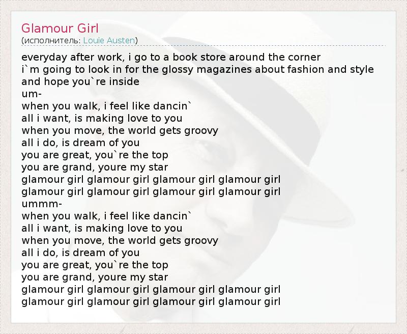 everyday after work, i go to a book store around the corner i`m going to look in for the glossy magazines about fashion and style and hope you`re inside um- when you walk, i feel like dancin` all i want, is making love to you when you move, the world gets groovy all i do, is dream of you you are great, you`re the top you are grand, youre my star glamour girl glamour girl glamour girl glamour girl glamour girl glamour girl glamour girl glamour girl ummm- when you walk, i feel like dancin` all i want, is making love to you when you move, the world gets groovy all i do, is dream of you you are great, you`re the top you are grand, youre my star glamour girl glamour girl glamour girl glamour girl glamour girl glamour girl glamour girl glamour girl