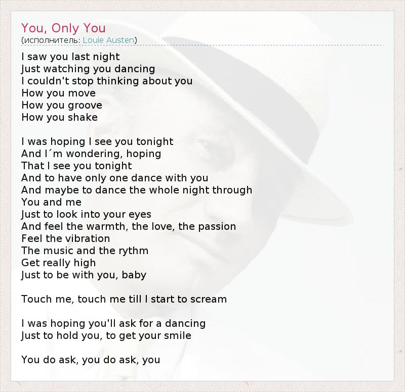 I saw you last night Just watching you dancing I couldn't stop thinking about you How you move How you groove How you shake I was hoping I see you tonight And I´m wondering, hoping That I see you tonight And to have only one dance with you And maybe to dance the whole night through You and me Just to look into your eyes And feel the warmth, the love, the passion Feel the vibration The music and the rythm Get really high Just to be with you, baby Touch me, touch me till I start to scream I was hoping you'll ask for a dancing Just to hold you, to get your smile You do ask, you do ask, you